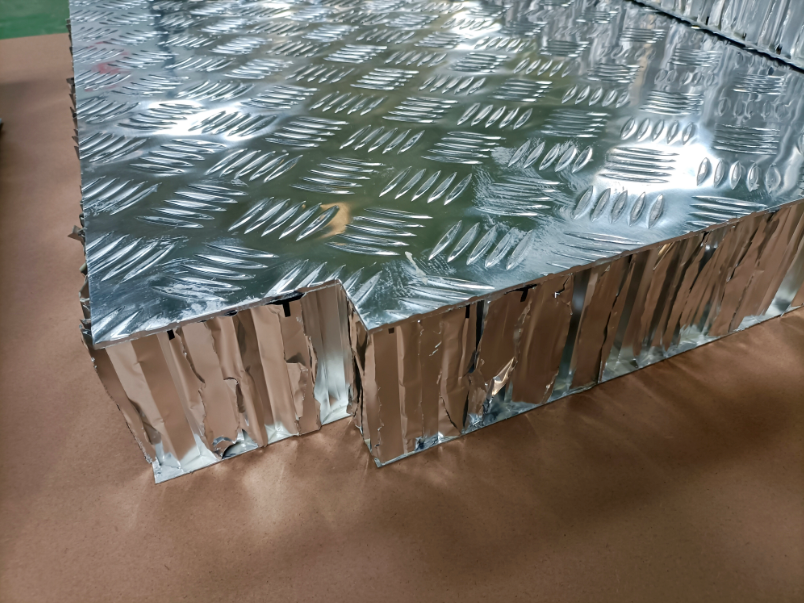 3、优越的平整度和刚性:铝蜂窝板由许多相互牵制的密集蜂窝构成,犹如许多小工字梁,可分散承受来自面板方向的压力,使板受力均匀,保证了其承受压力的强度和面板在较大面积时保持很高的平整度。