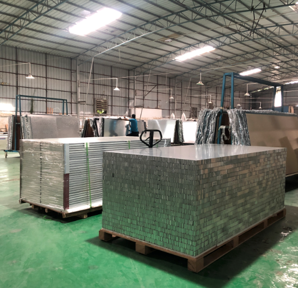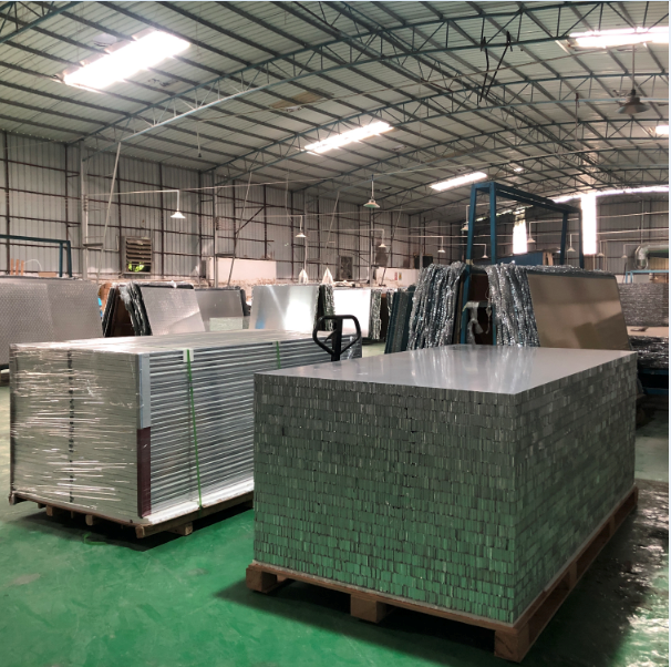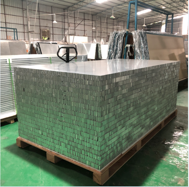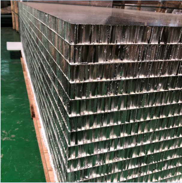 3、优越的平整度和刚性:铝蜂窝板由许多相互牵制的密集蜂窝构成,犹如许多小工字梁,可分散承受来自面板方向的压力,使板受力均匀,保证了其承受压力的强度和面板在较大面积时保持很高的平整度。