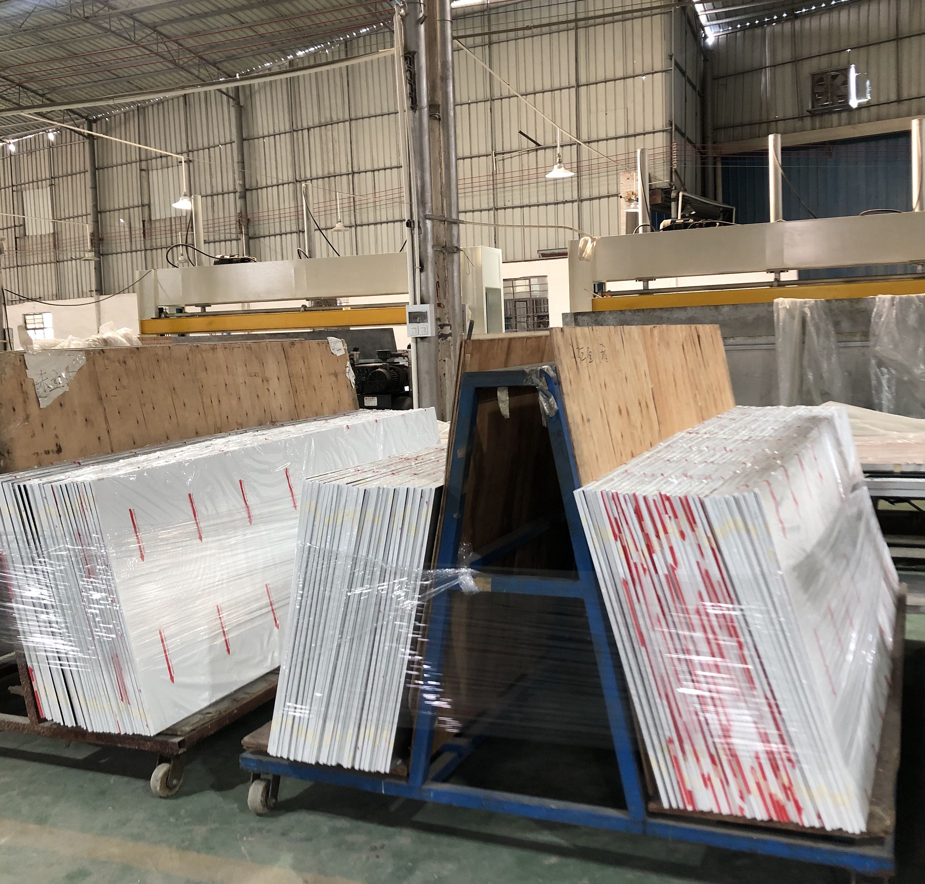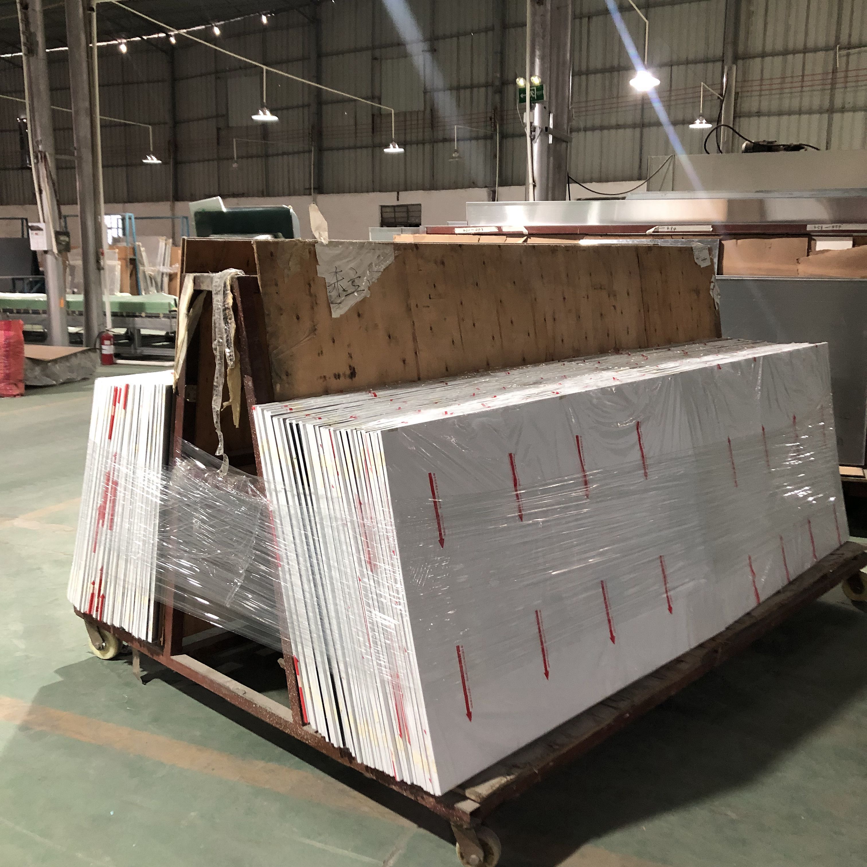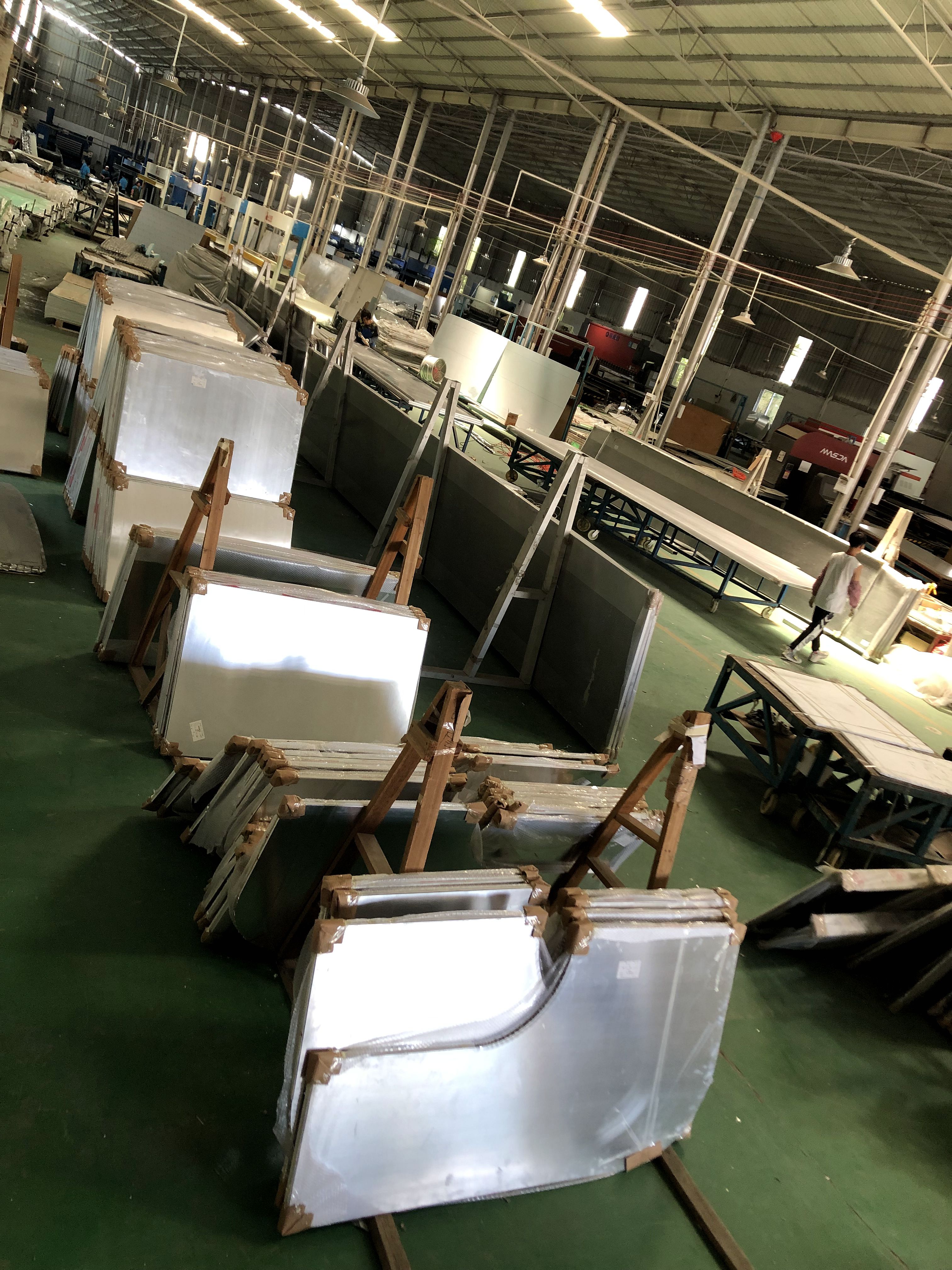 3、优越的平整度和刚性:铝蜂窝板由许多相互牵制的密集蜂窝构成,犹如许多小工字梁,可分散承受来自面板方向的压力,使板受力均匀,保证了其承受压力的强度和面板在较大面积时保持很高的平整度。