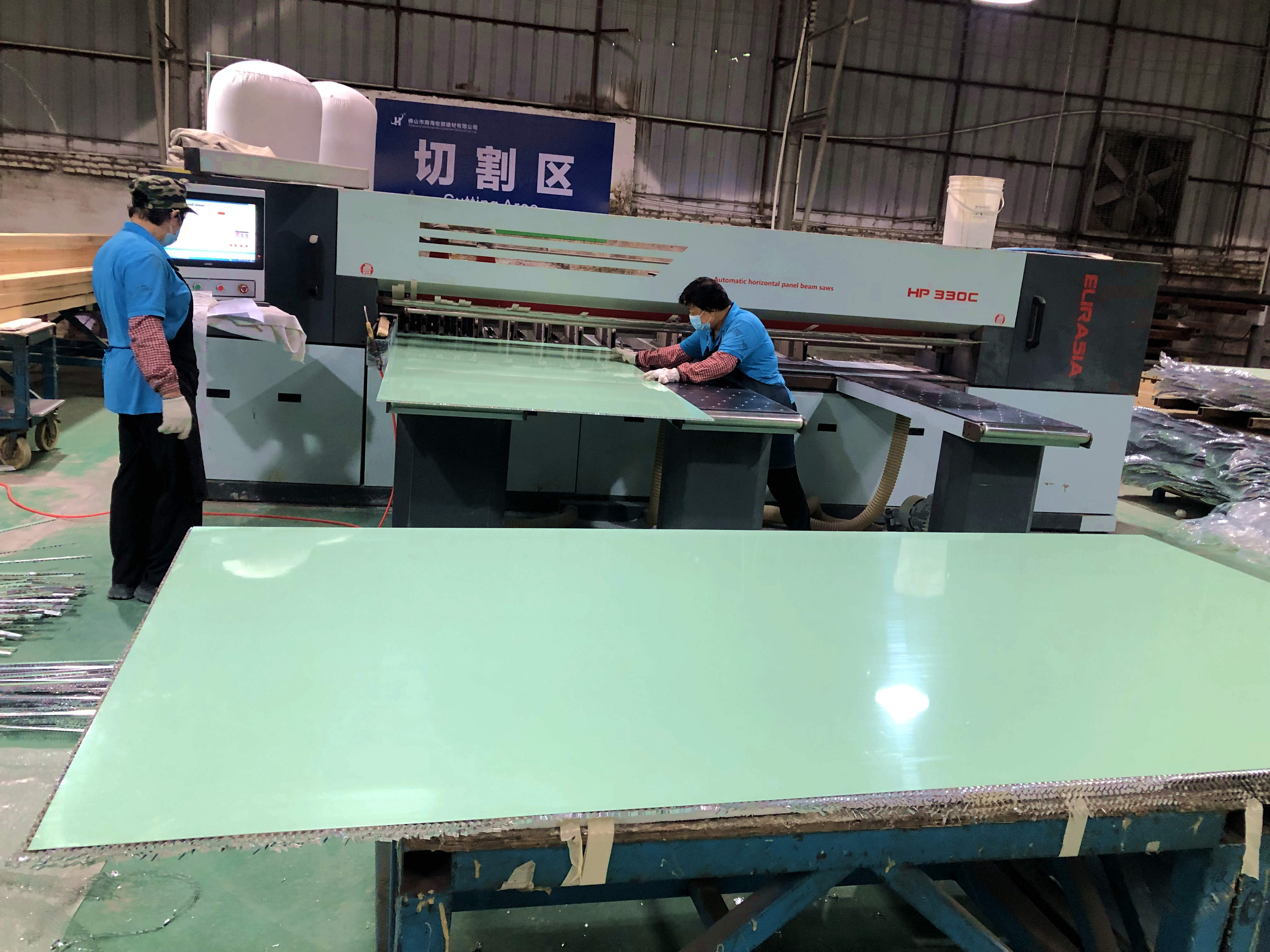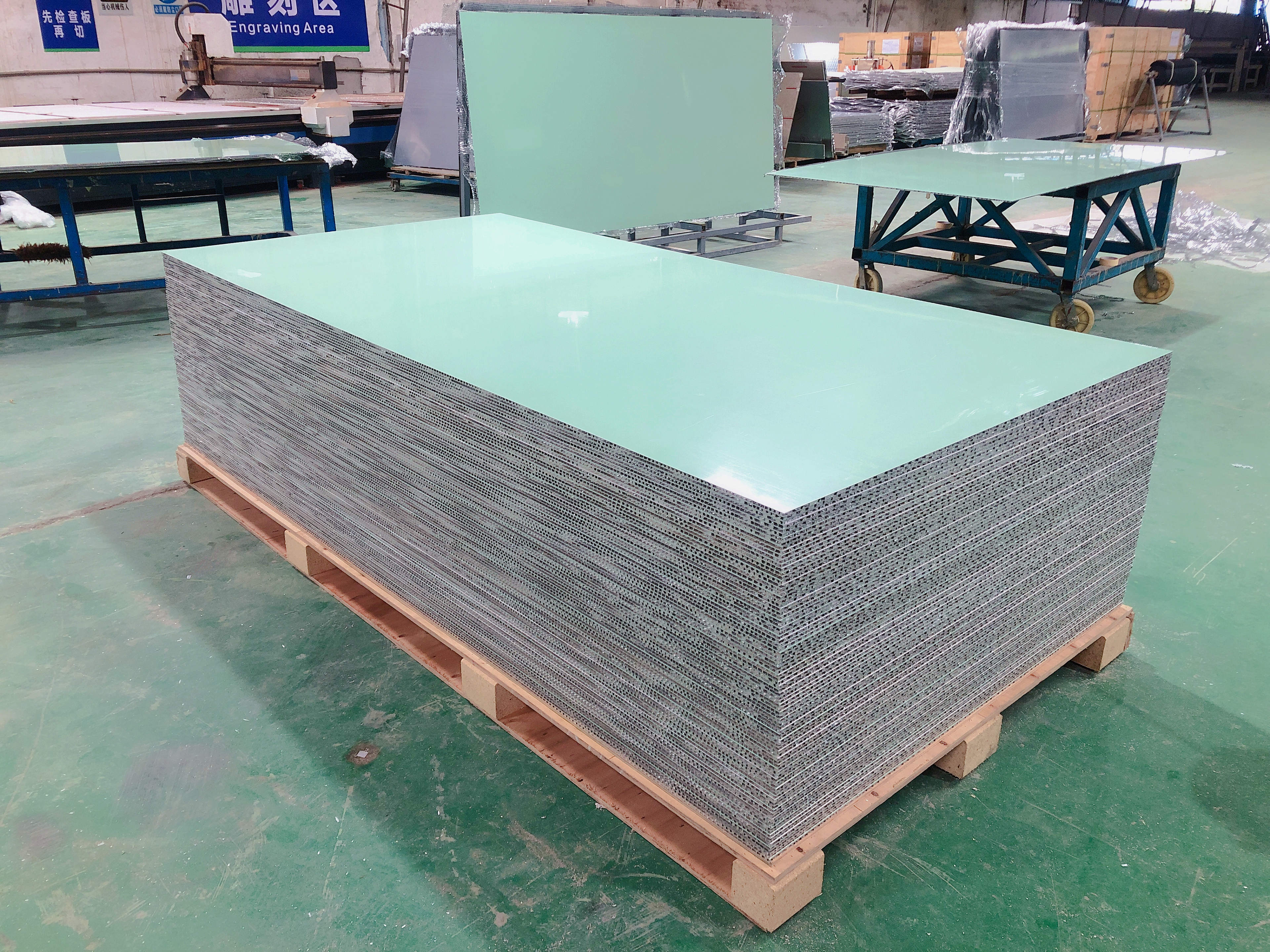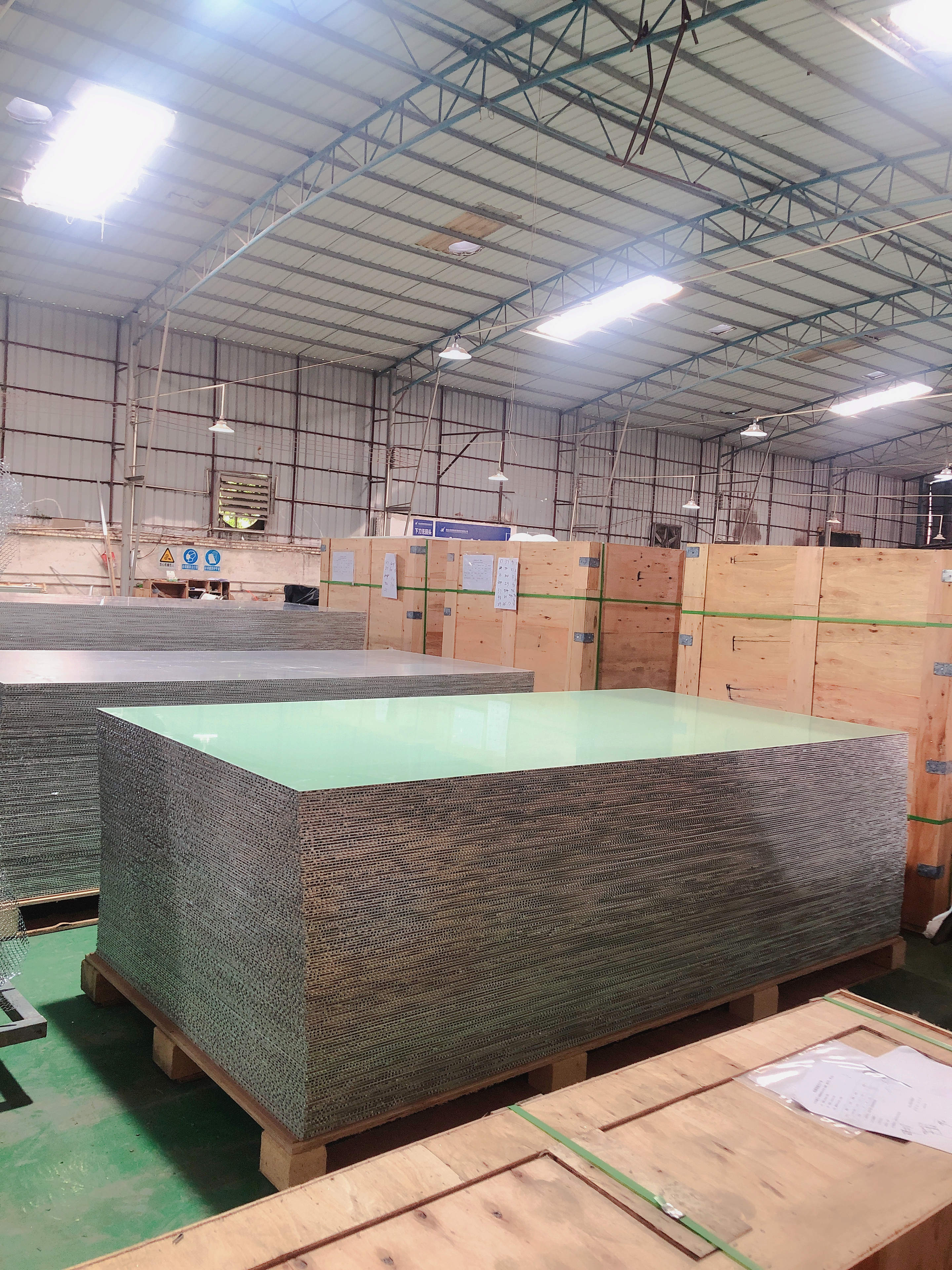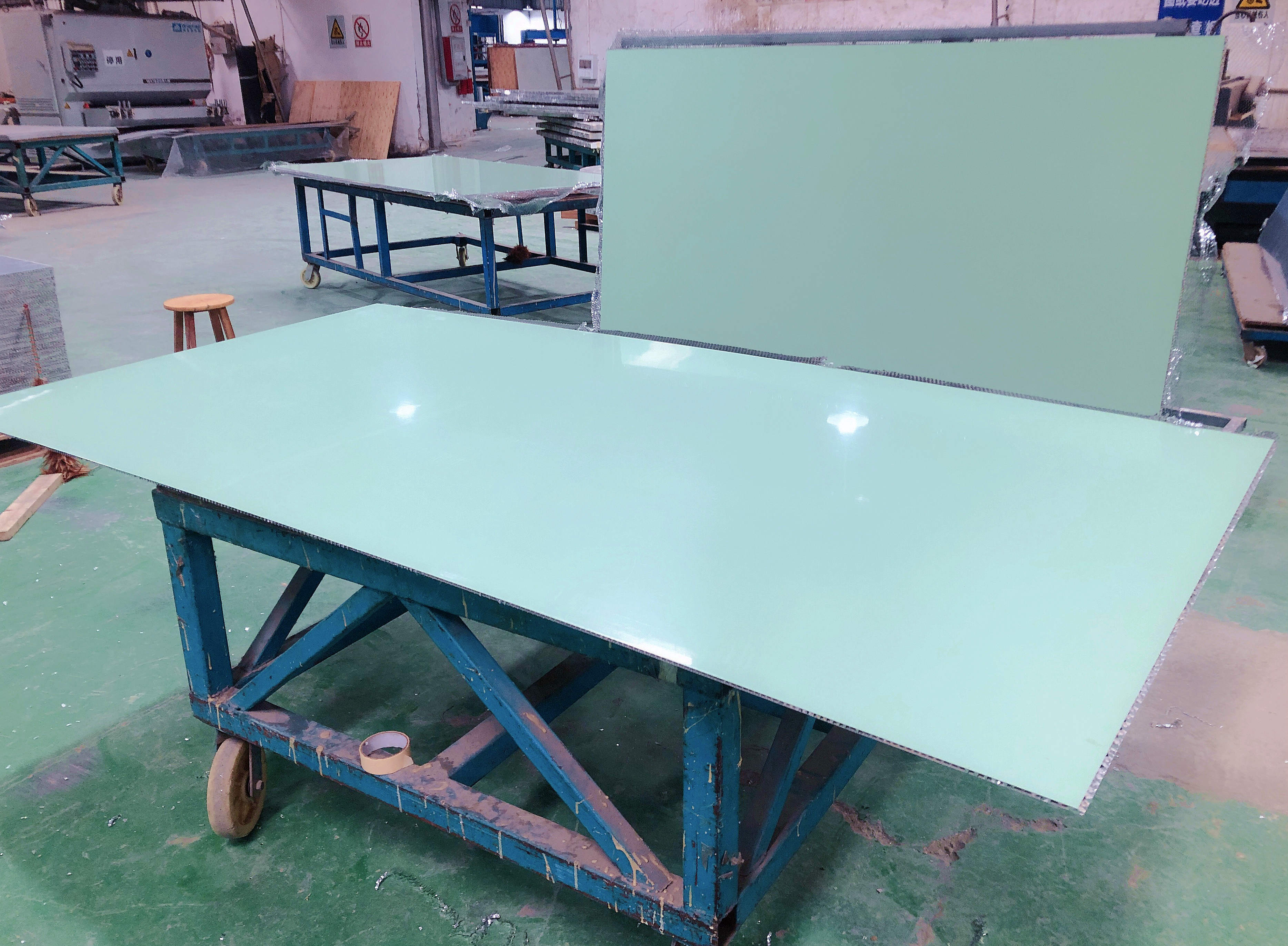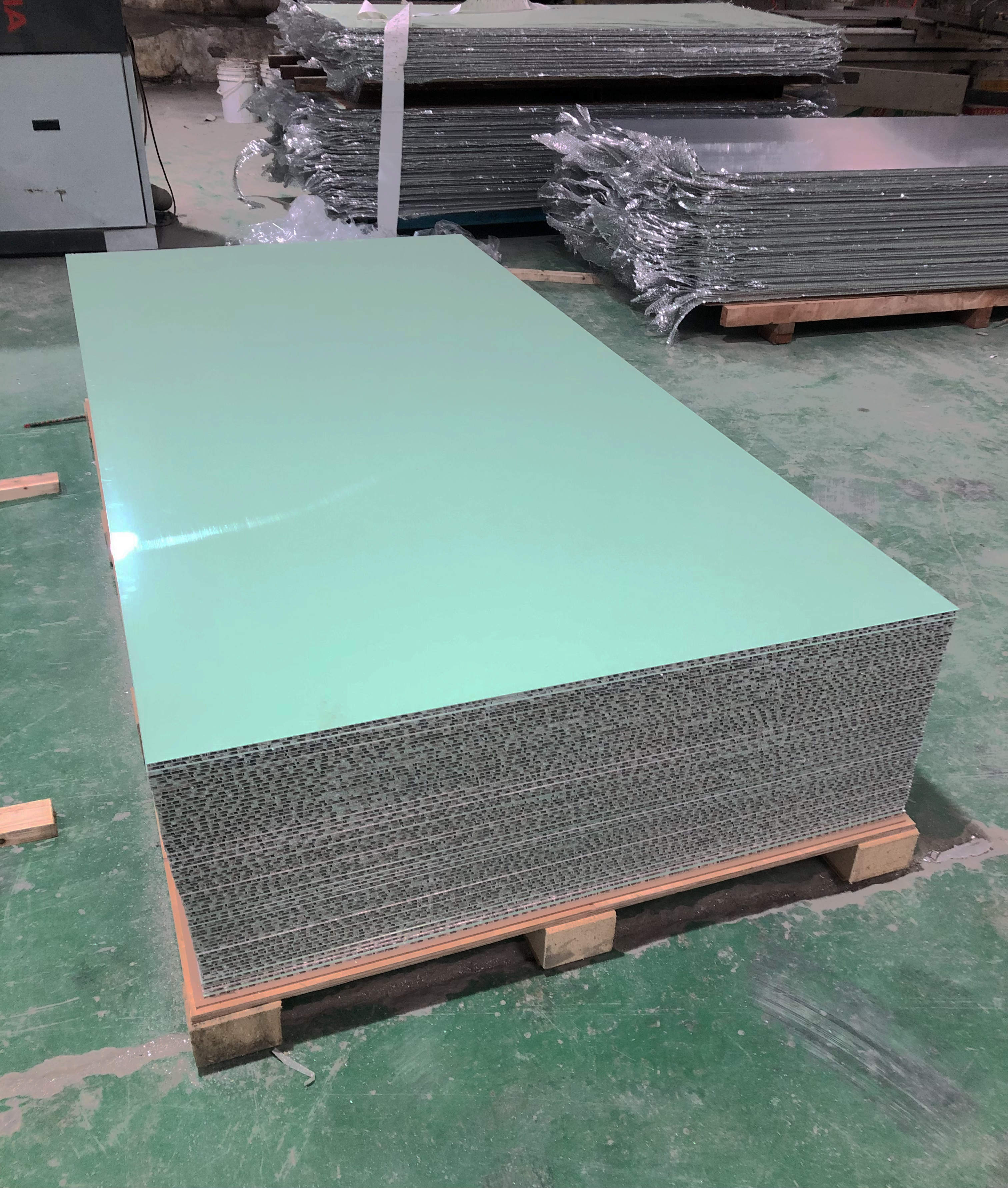3、优越的平整度和刚性:铝蜂窝板由许多相互牵制的密集蜂窝构成,犹如许多小工字梁,可分散承受来自面板方向的压力,使板受力均匀,保证了其承受压力的强度和面板在较大面积时保持很高的平整度。