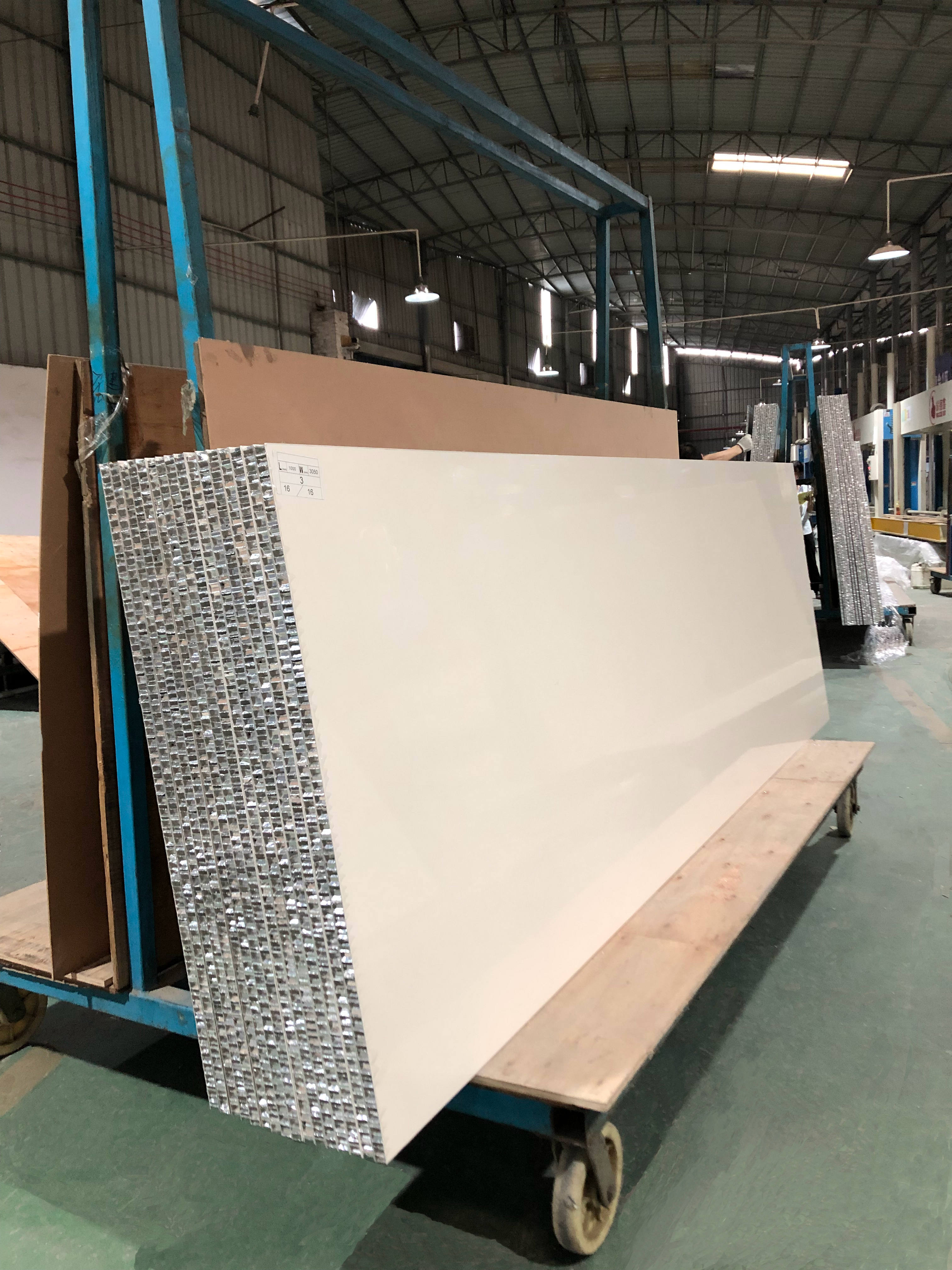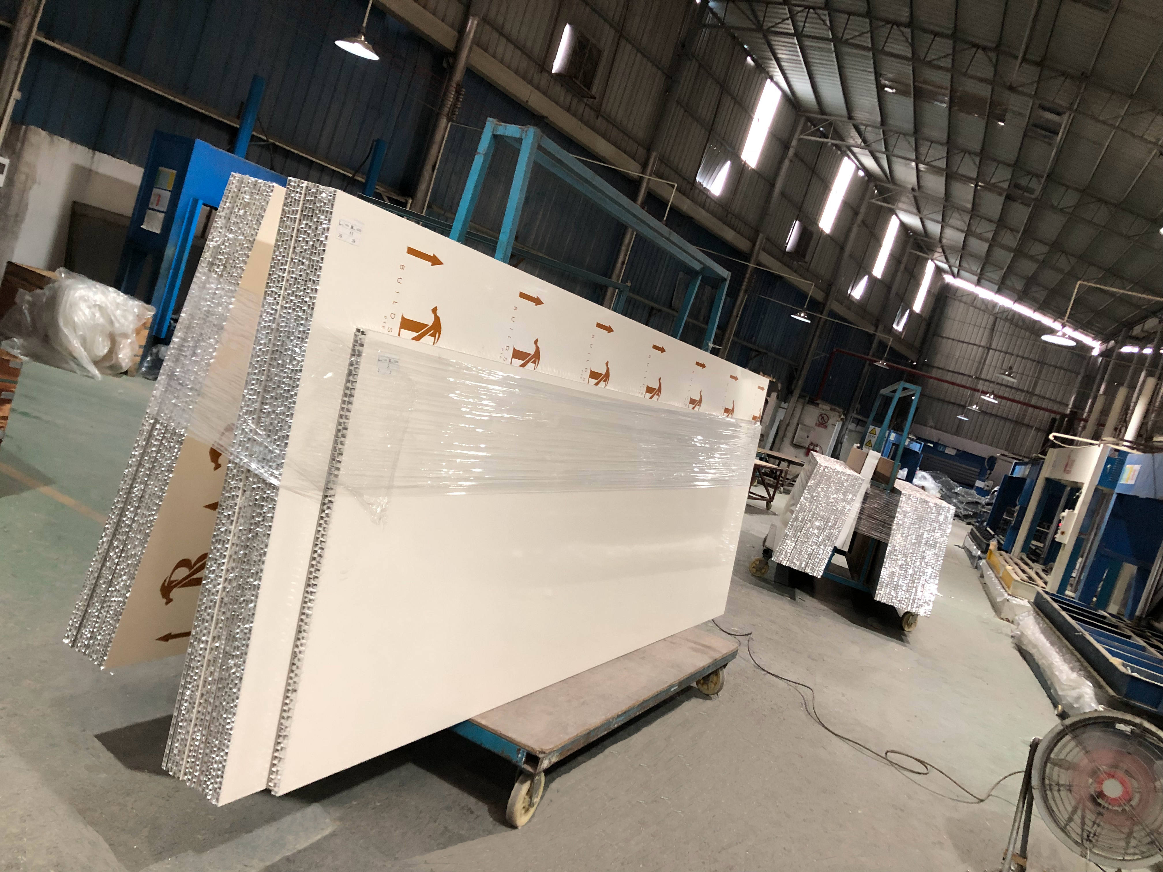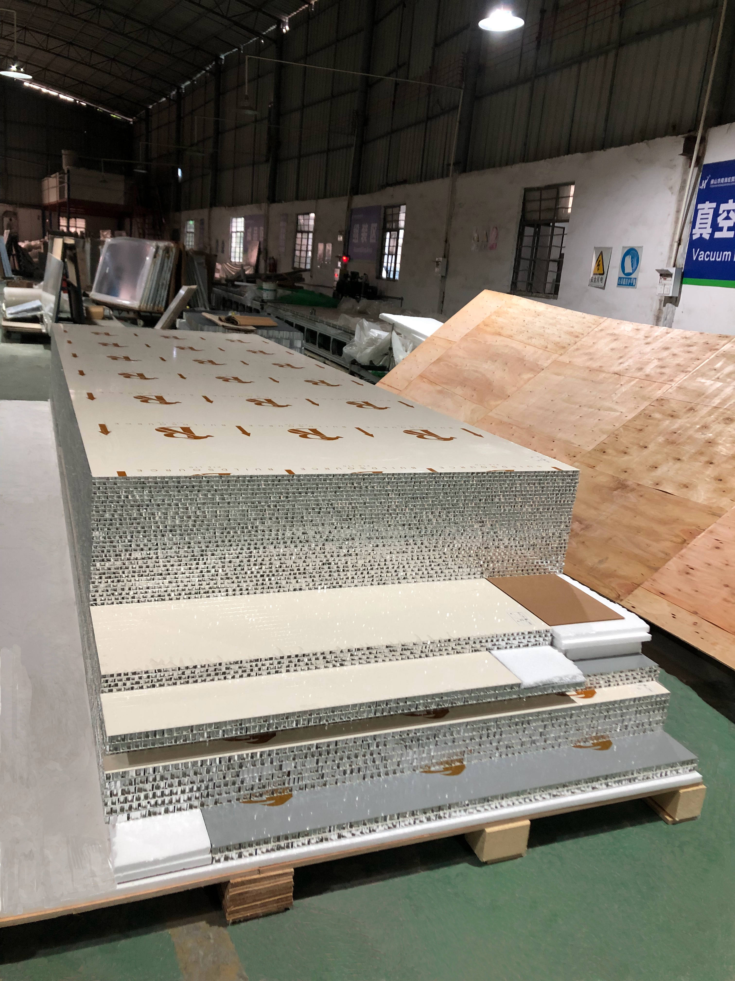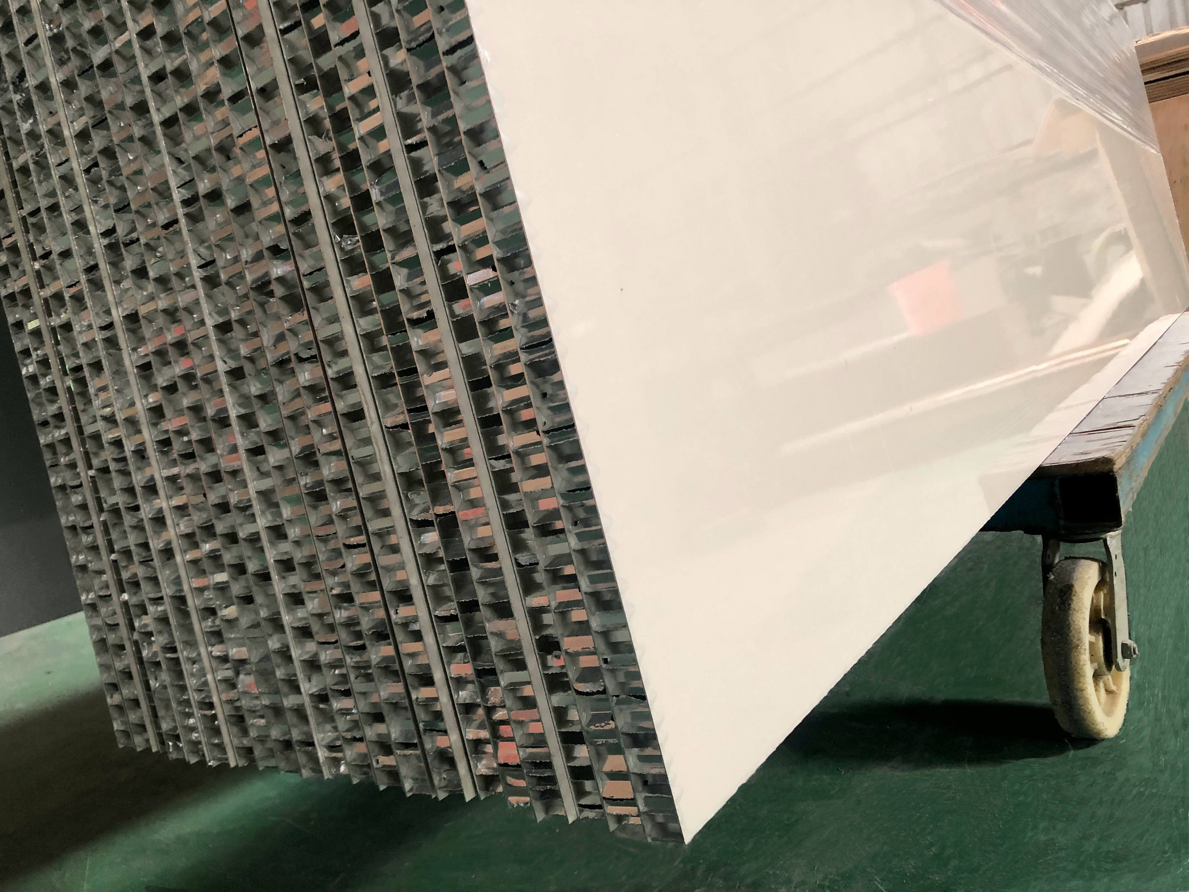 3、优越的平整度和刚性:铝蜂窝板由许多相互牵制的密集蜂窝构成,犹如许多小工字梁,可分散承受来自面板方向的压力,使板受力均匀,保证了其承受压力的强度和面板在较大面积时保持很高的平整度。