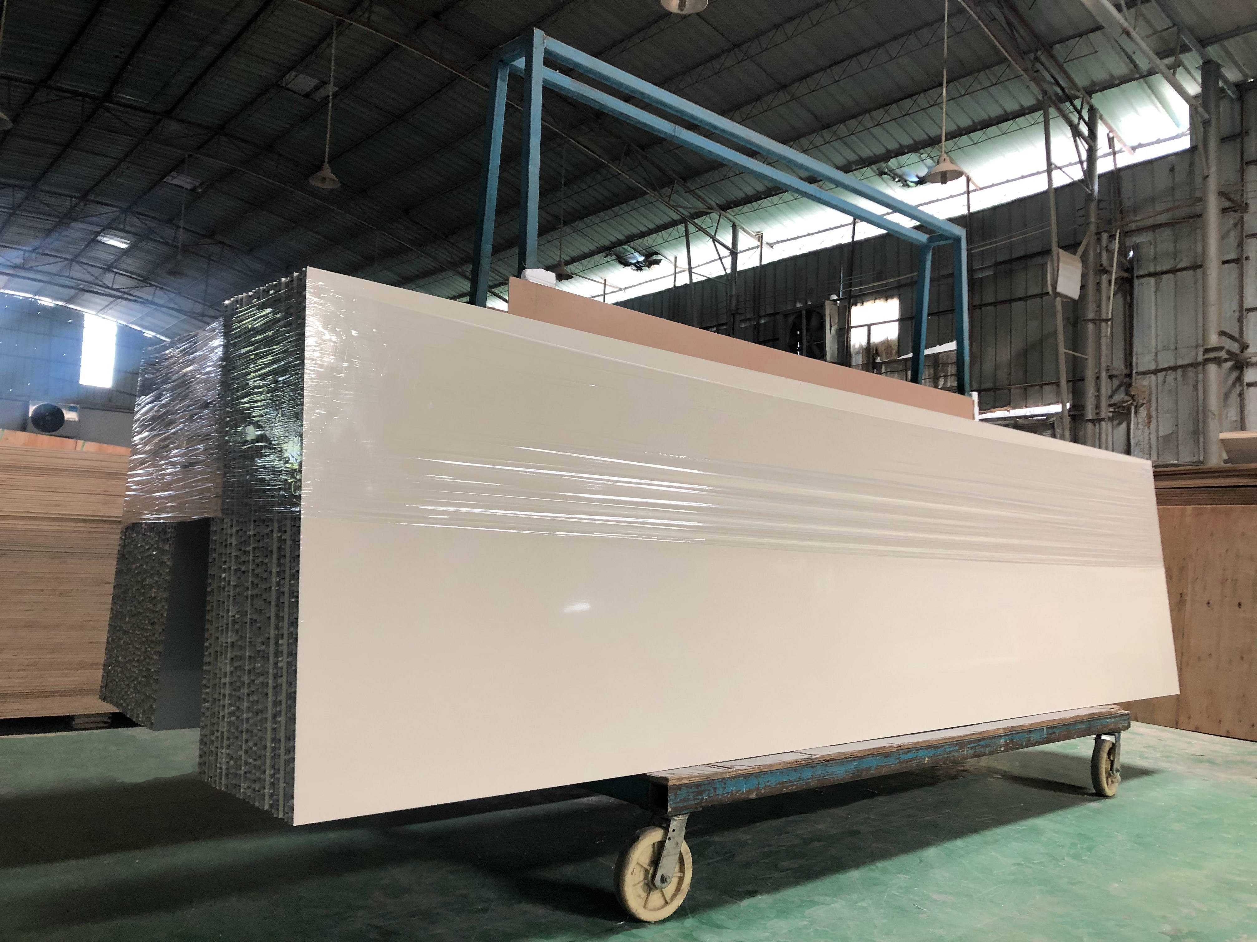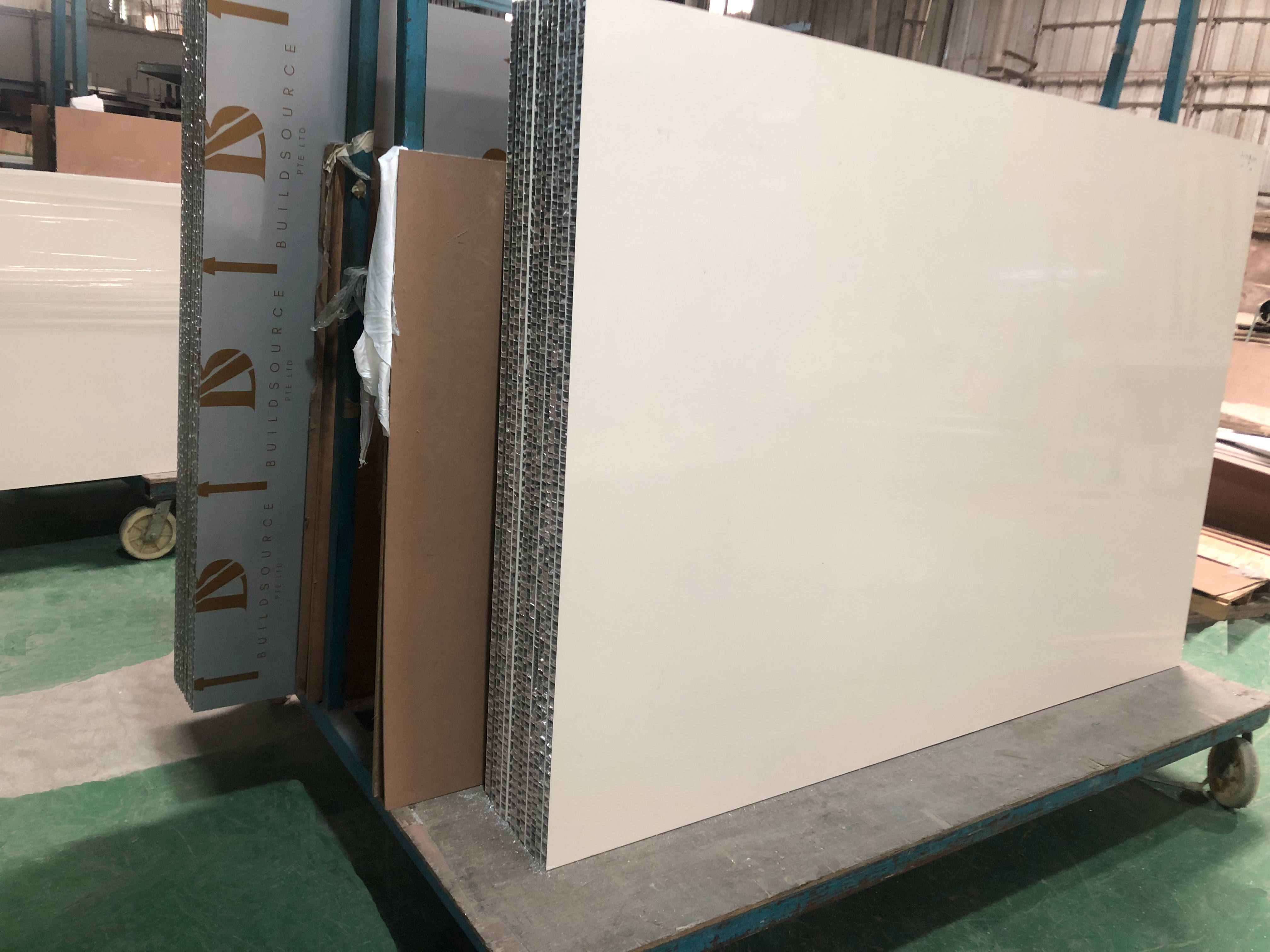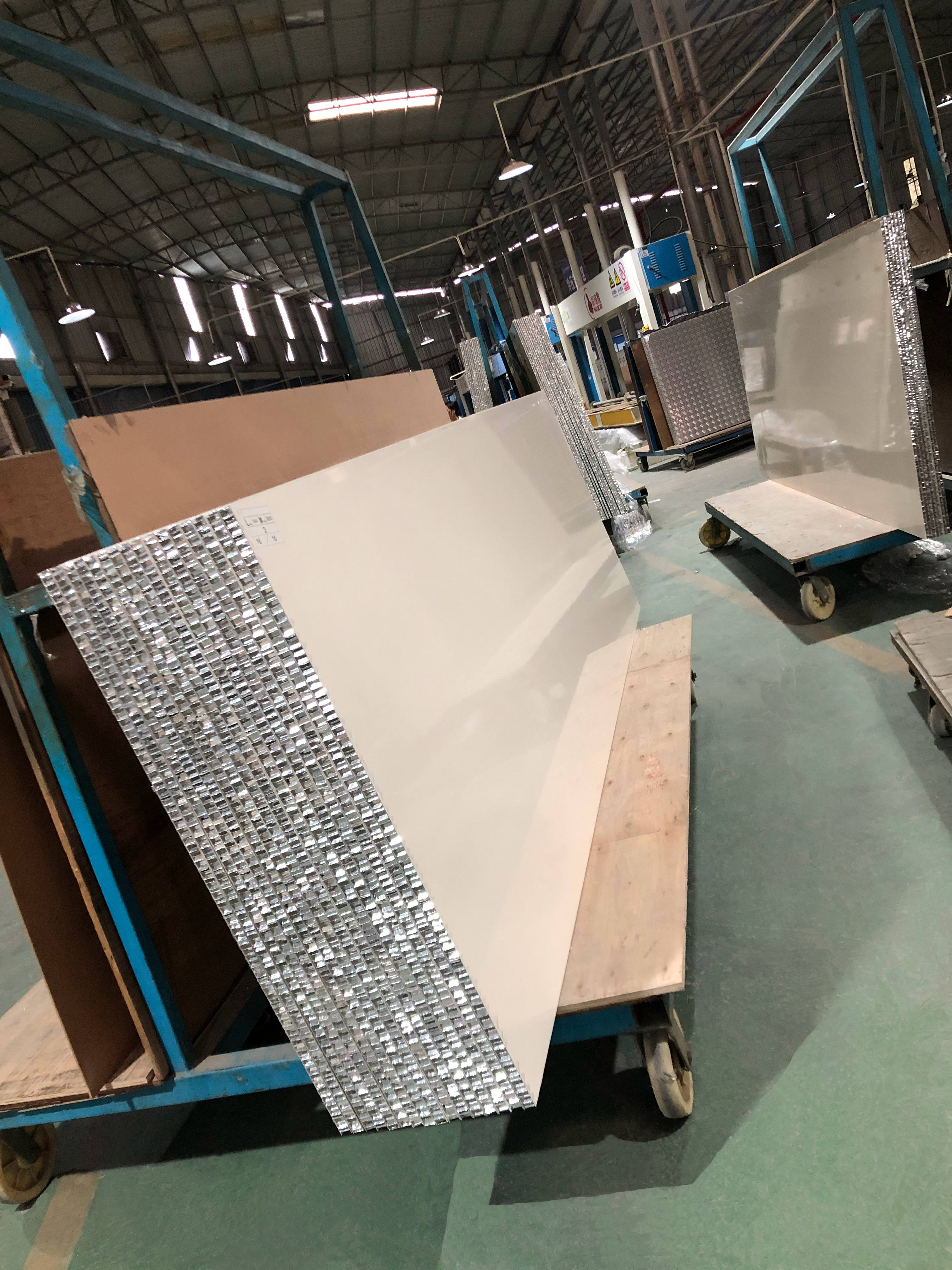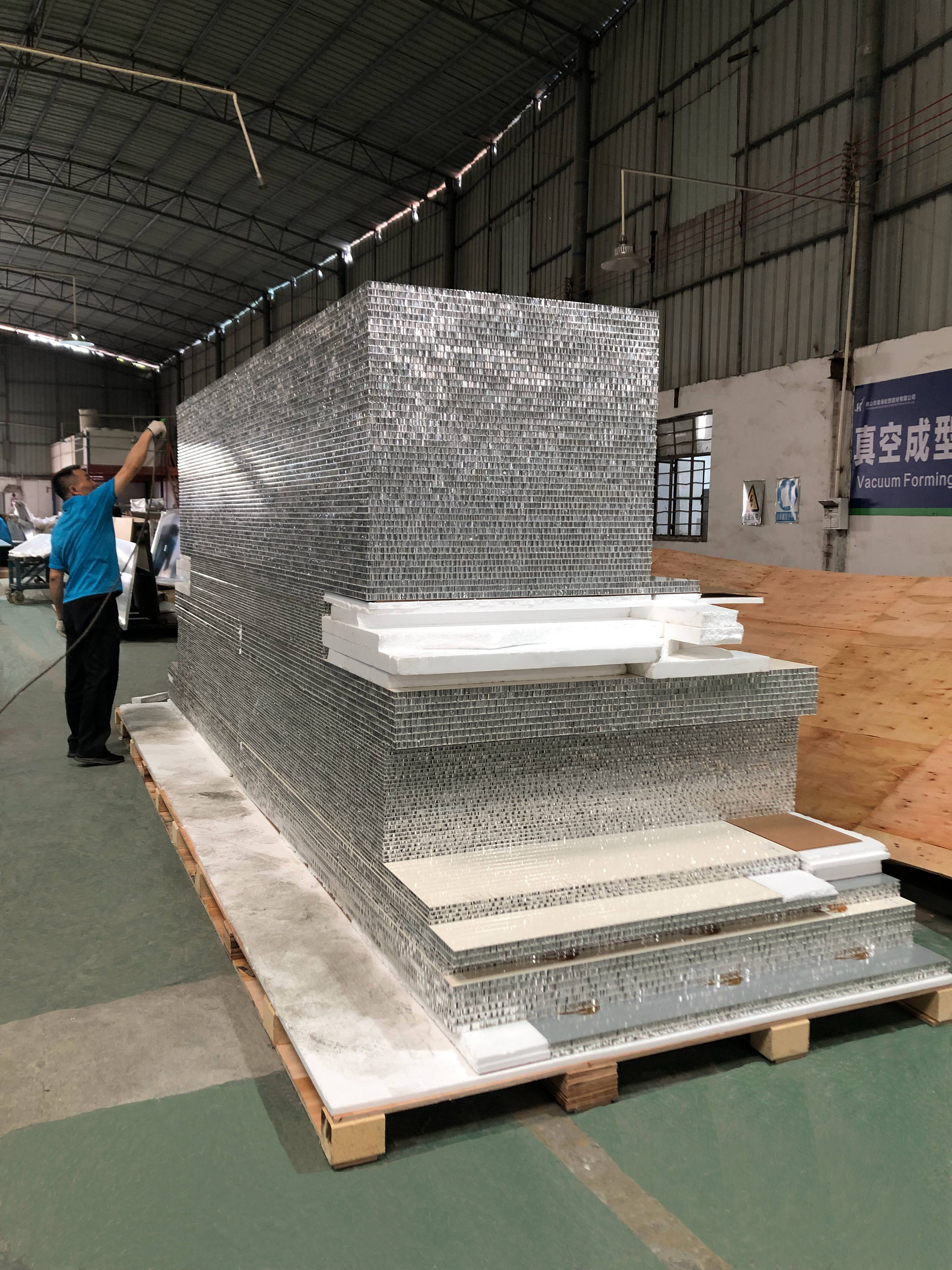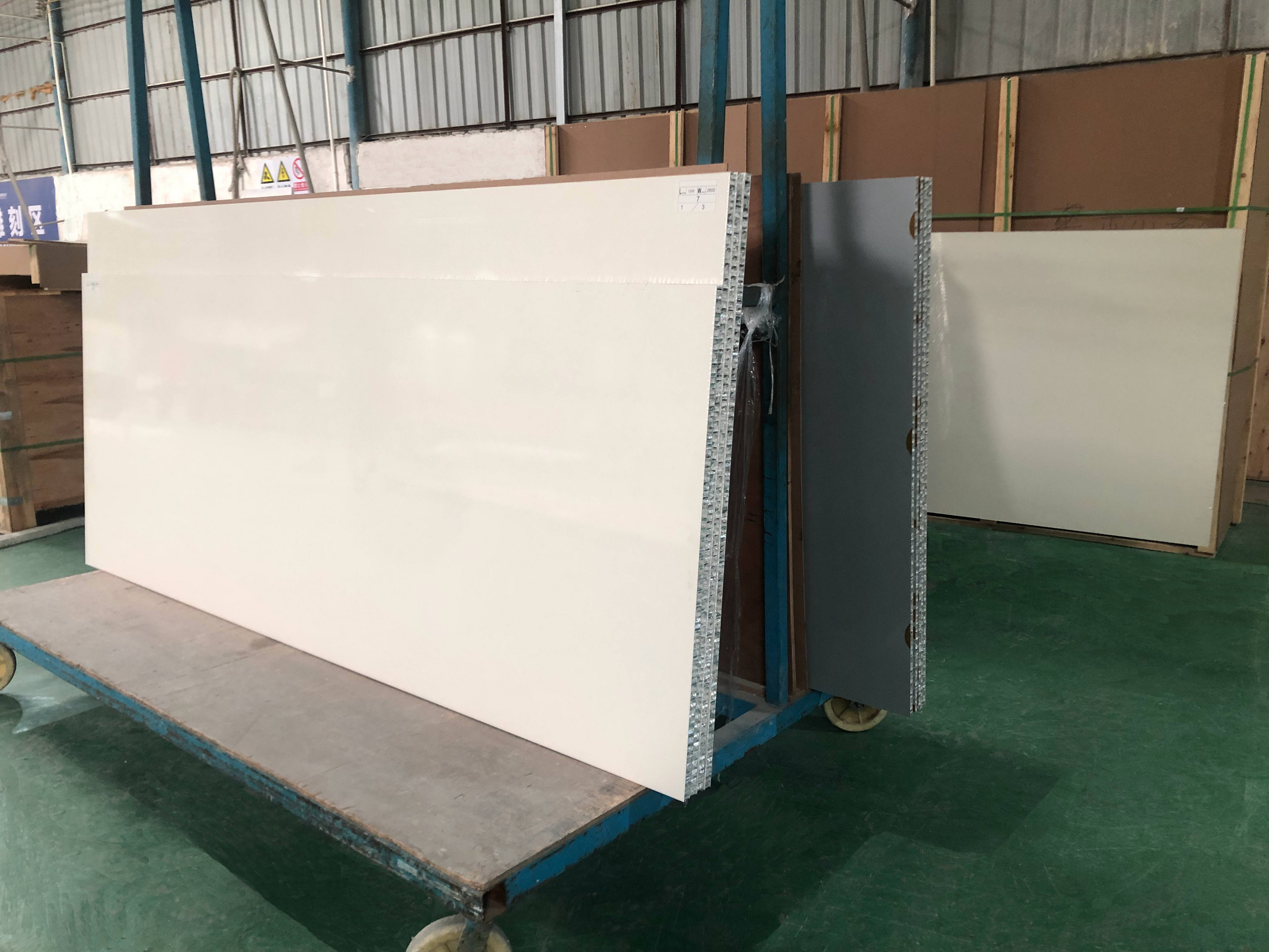 3、优越的平整度和刚性:铝蜂窝板由许多相互牵制的密集蜂窝构成,犹如许多小工字梁,可分散承受来自面板方向的压力,使板受力均匀,保证了其承受压力的强度和面板在较大面积时保持很高的平整度。