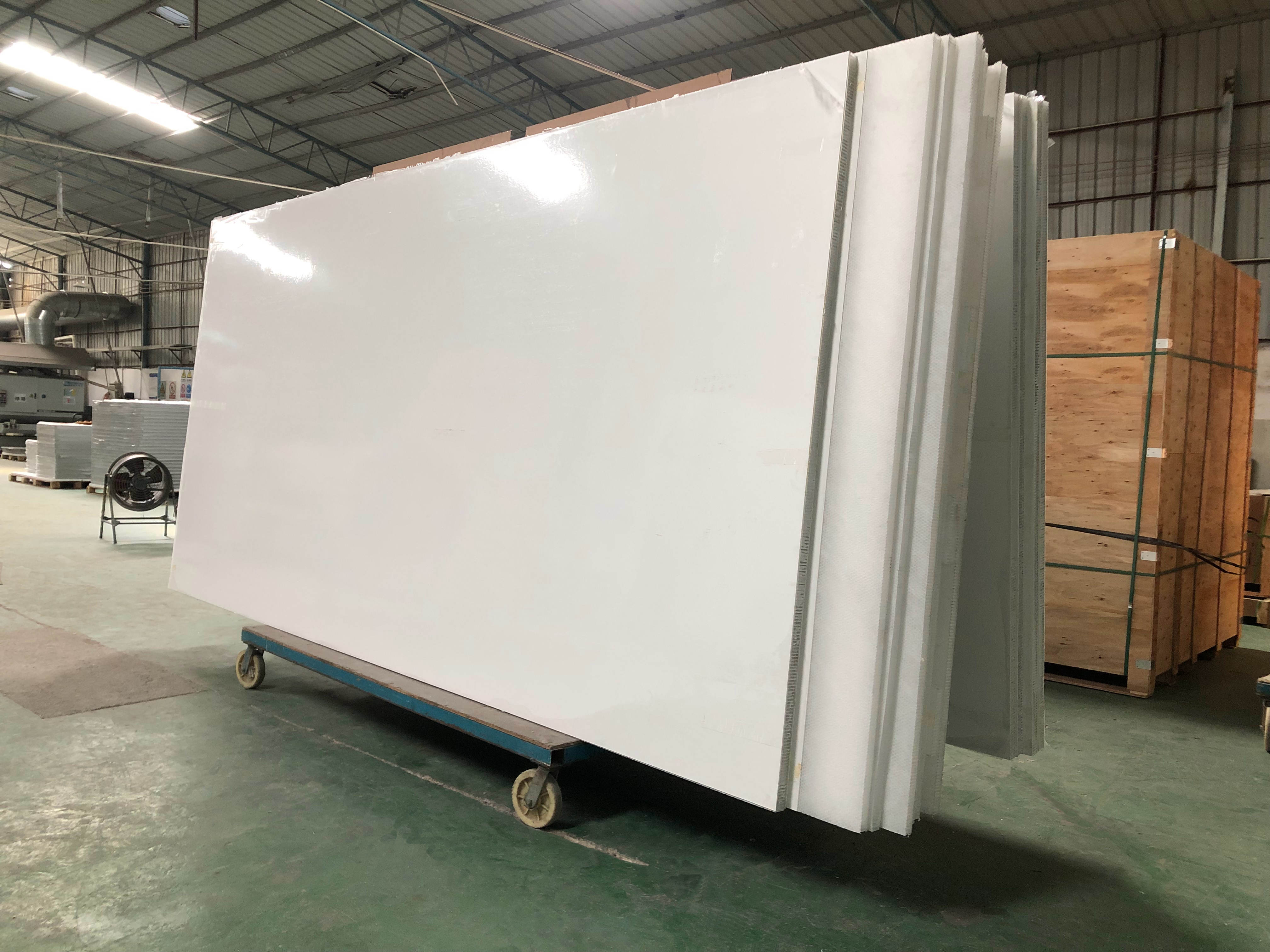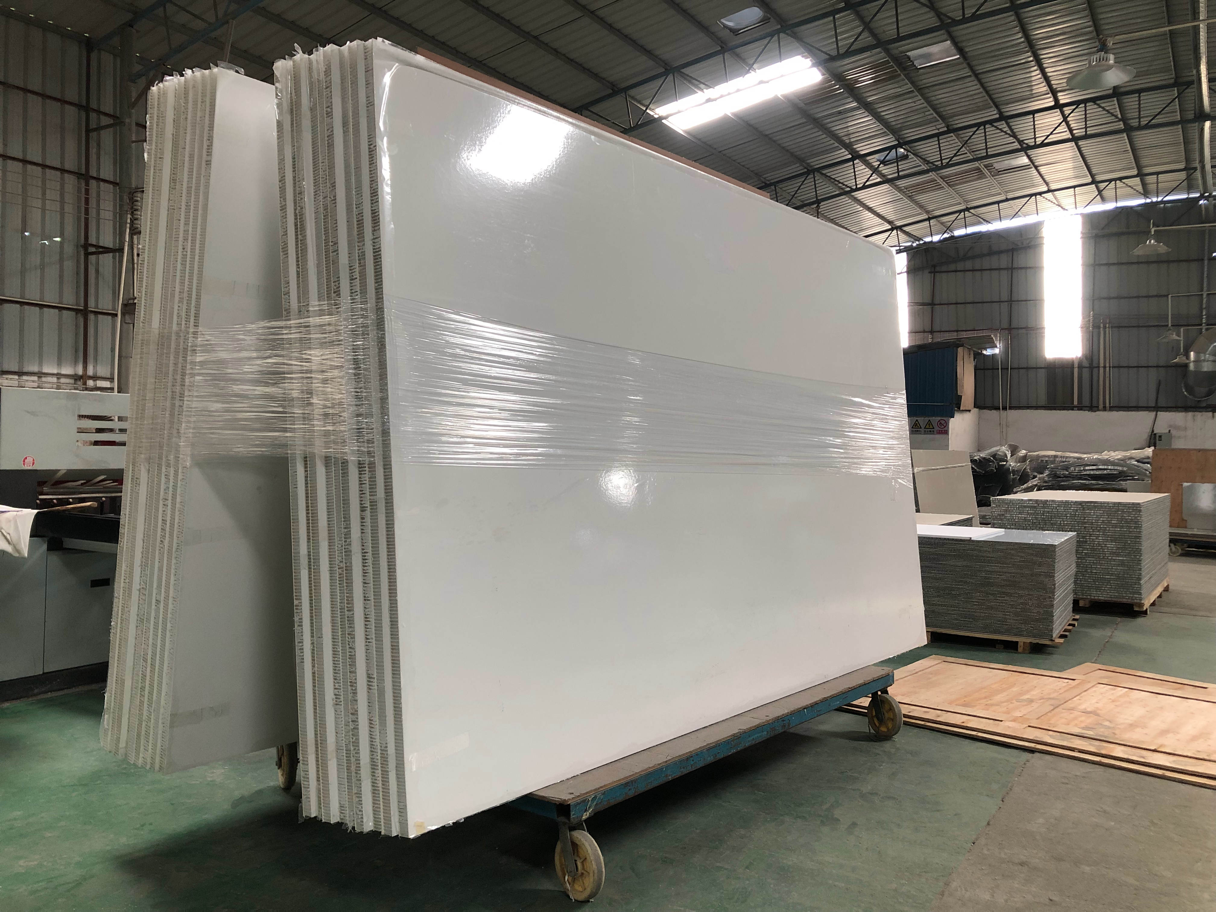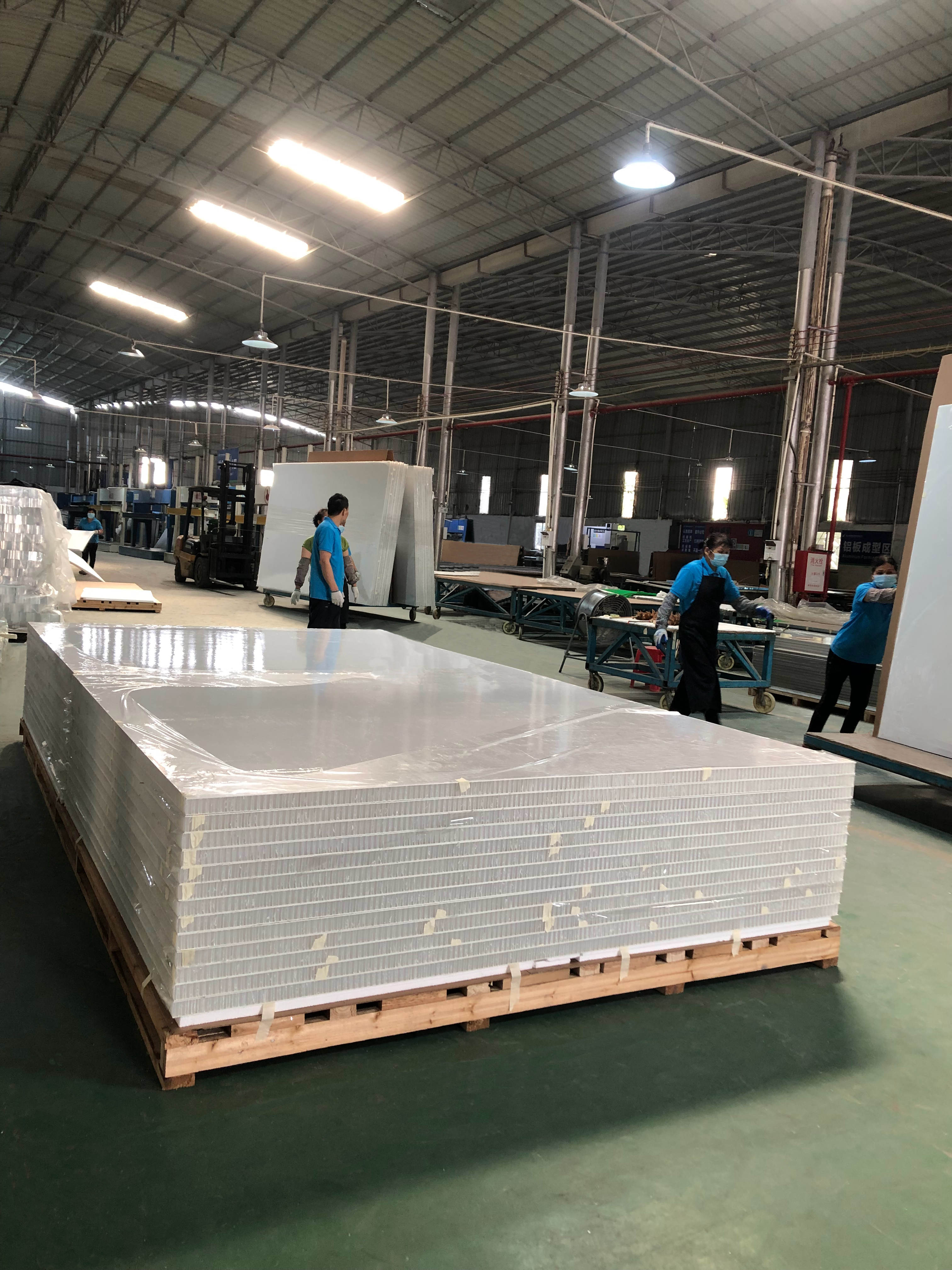 3、优越的平整度和刚性:铝蜂窝板由许多相互牵制的密集蜂窝构成,犹如许多小工字梁,可分散承受来自面板方向的压力,使板受力均匀,保证了其承受压力的强度和面板在较大面积时保持很高的平整度。