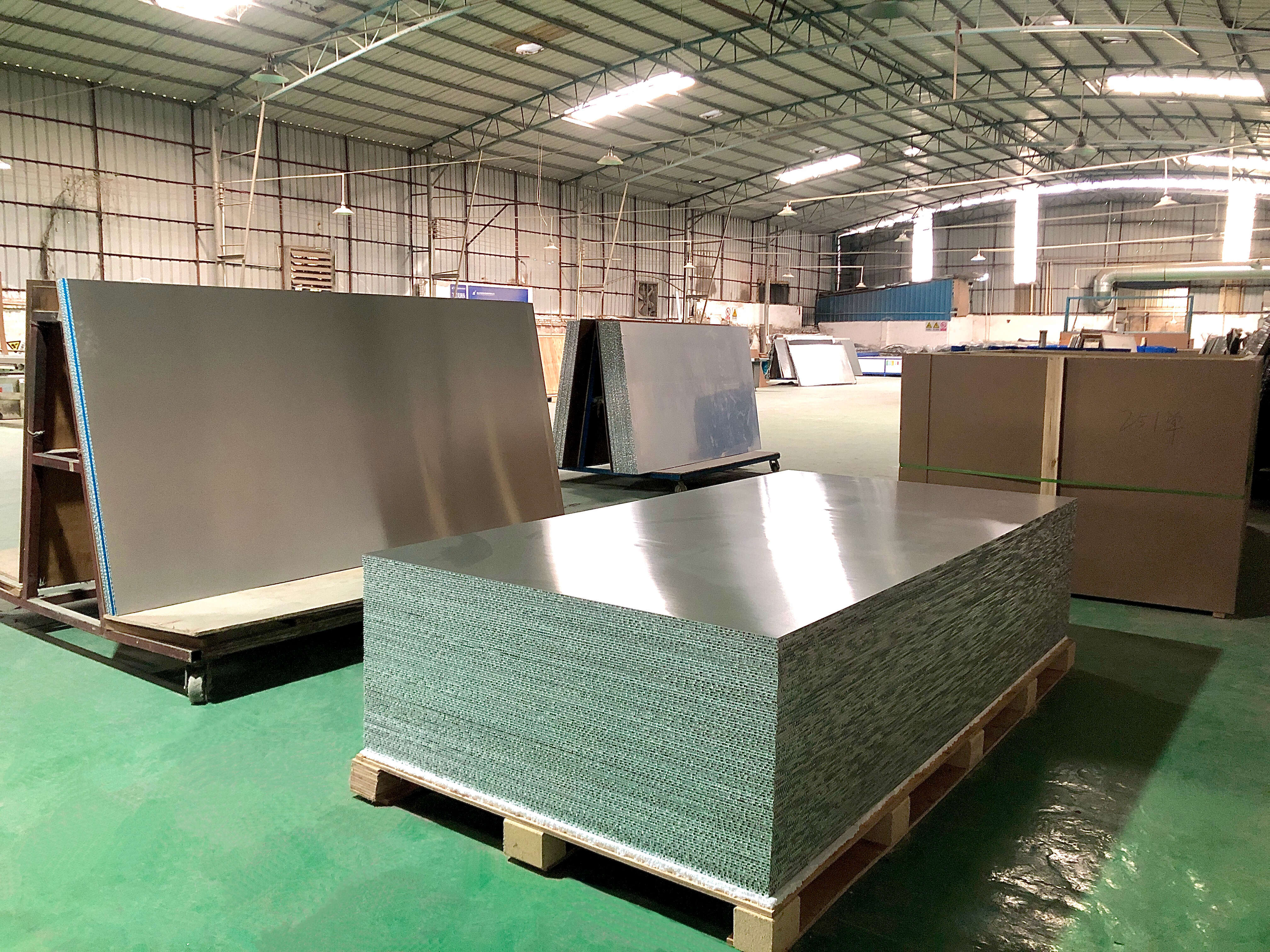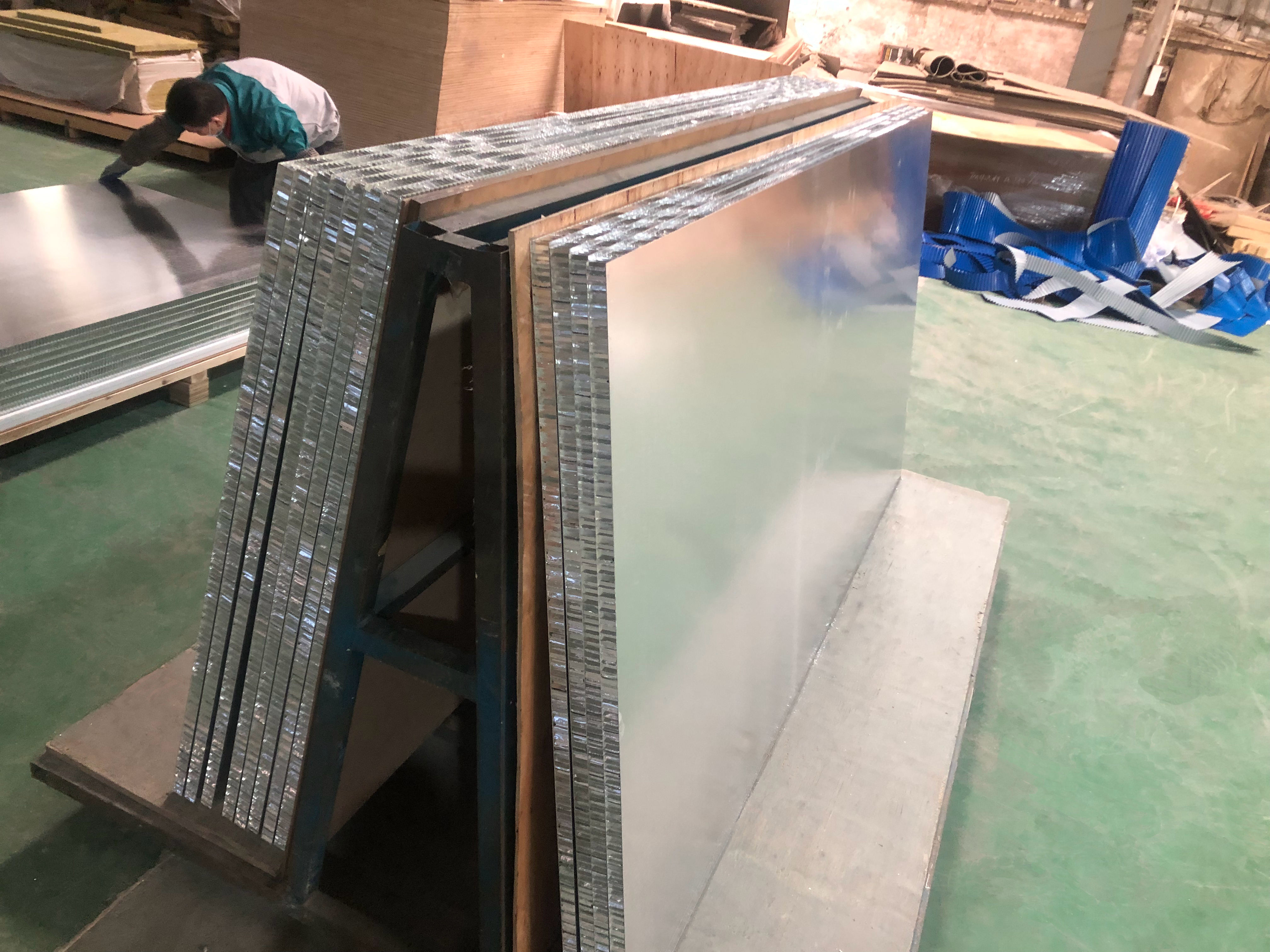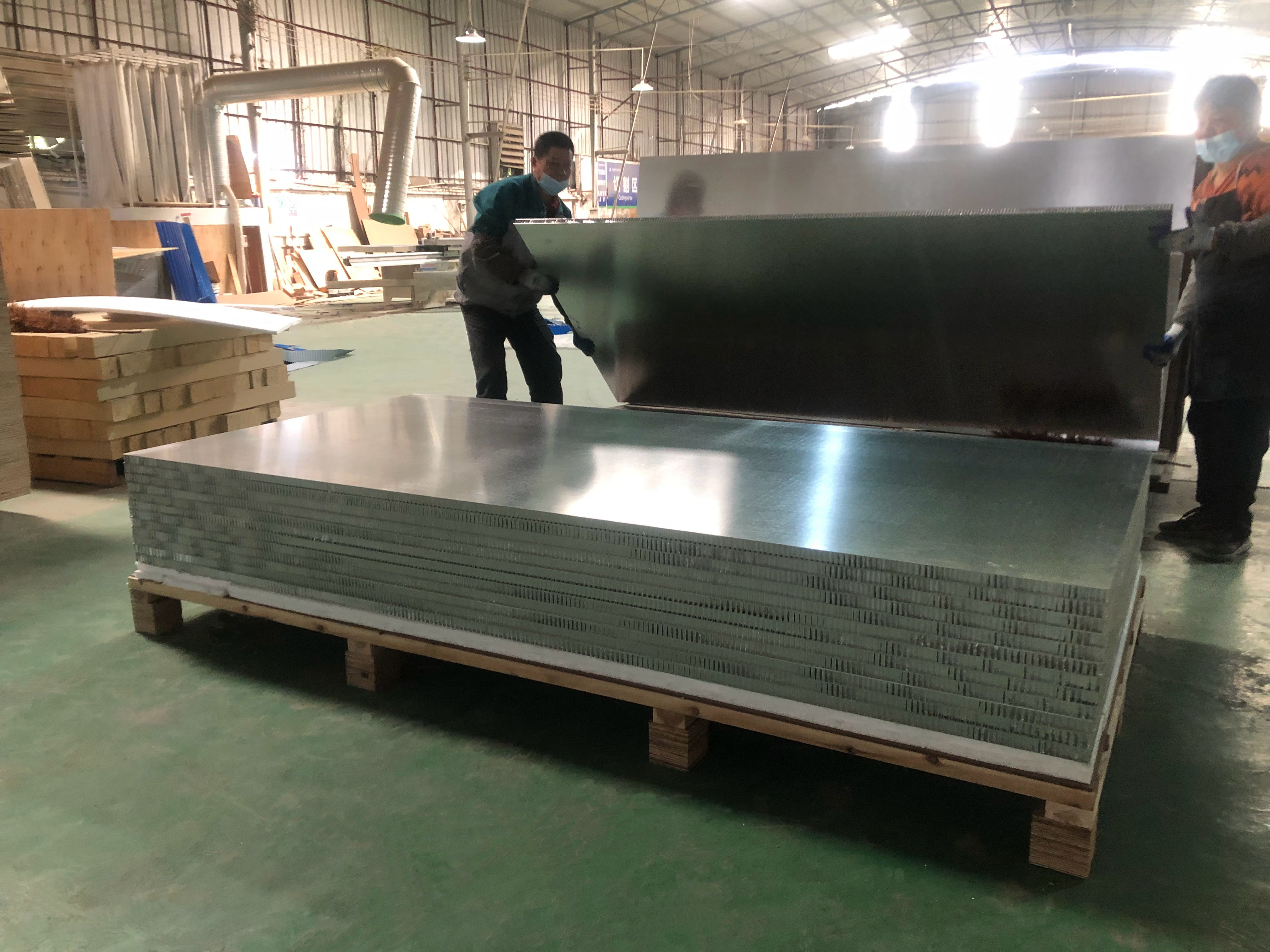 3、优越的平整度和刚性:铝蜂窝板由许多相互牵制的密集蜂窝构成,犹如许多小工字梁,可分散承受来自面板方向的压力,使板受力均匀,保证了其承受压力的强度和面板在较大面积时保持很高的平整度。
