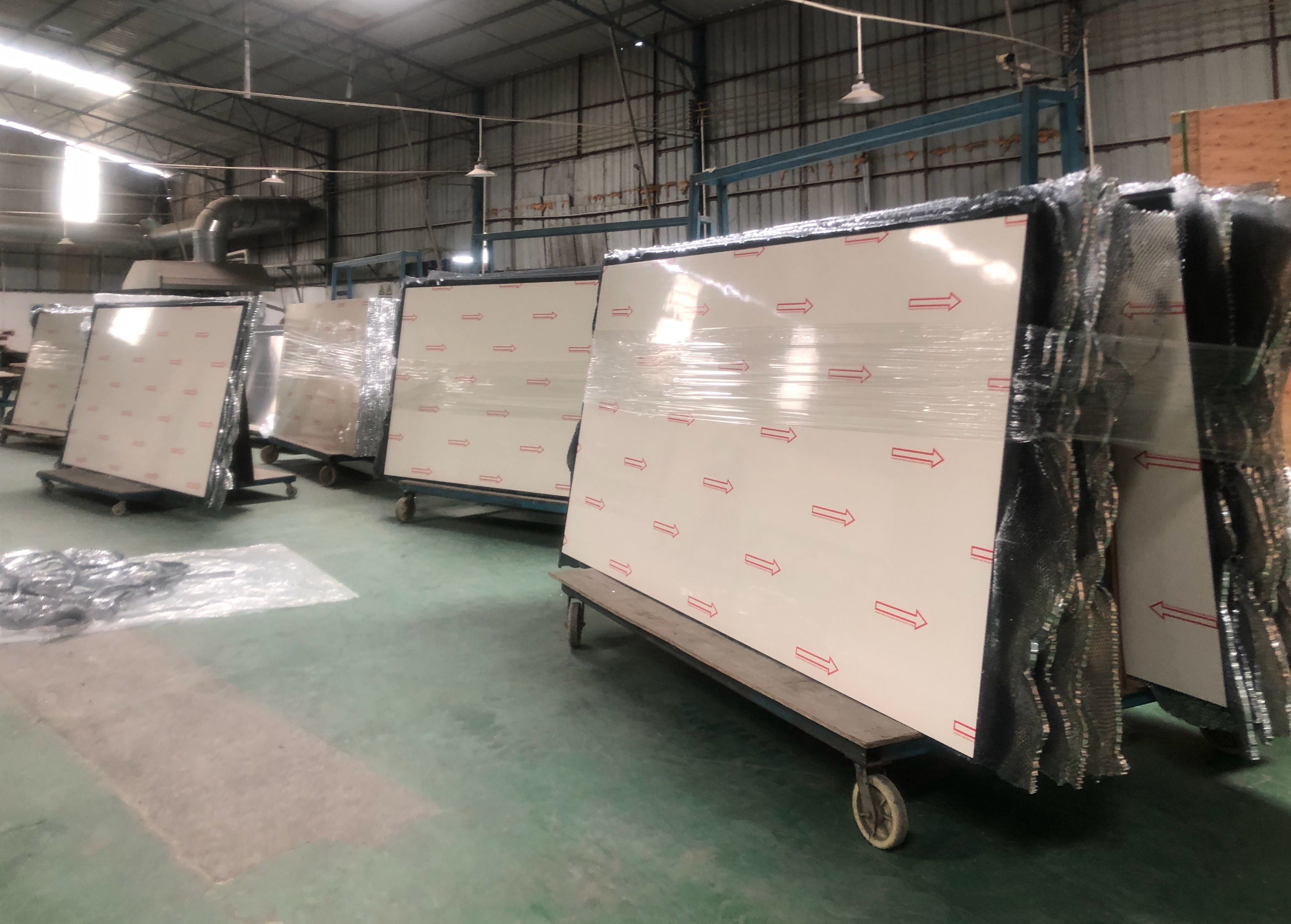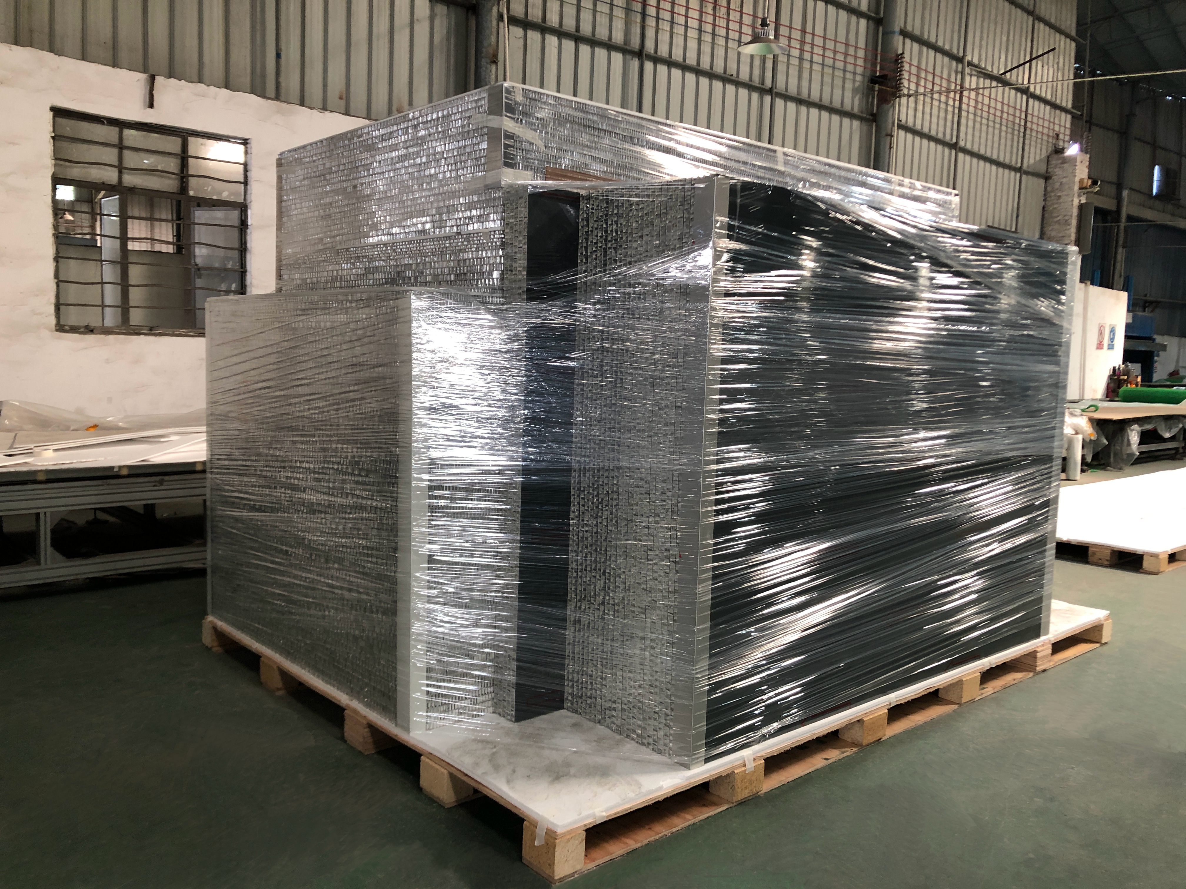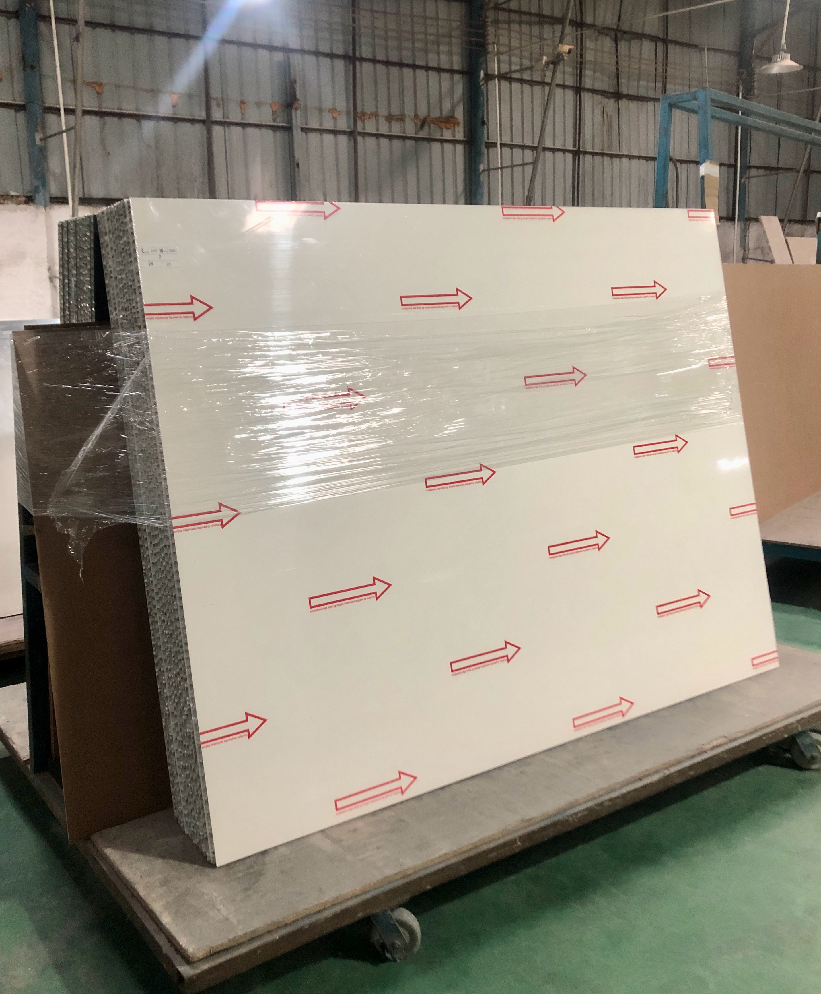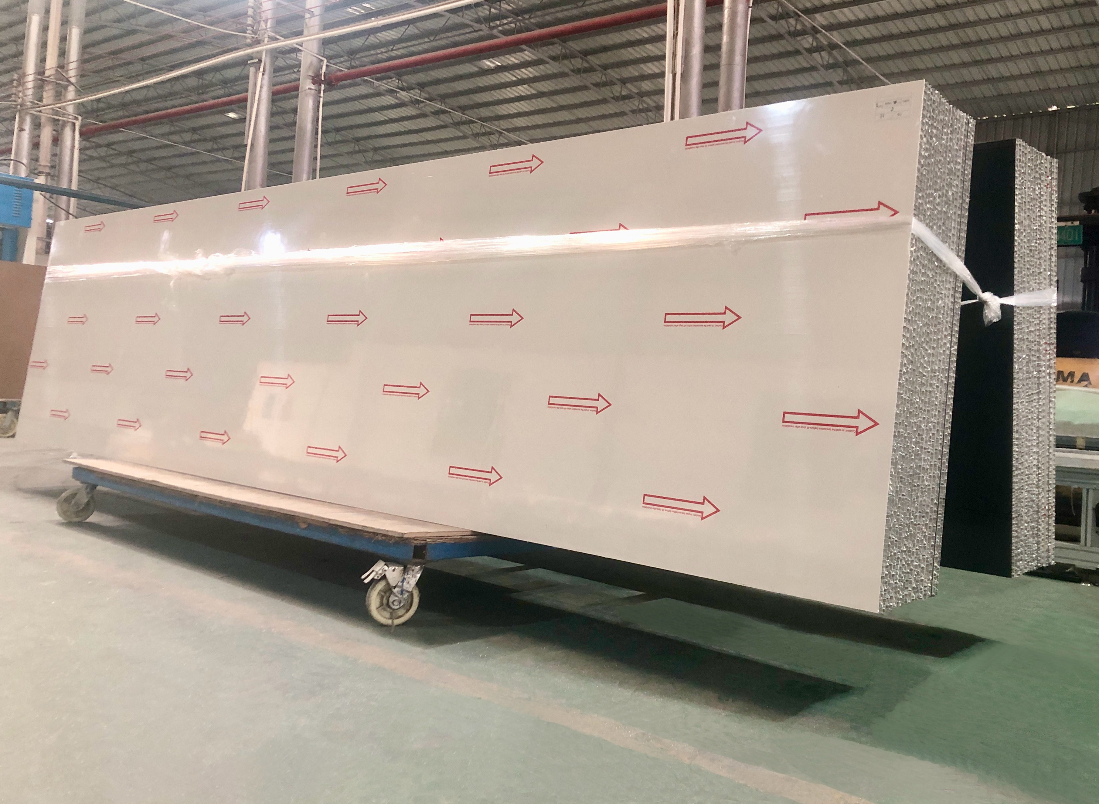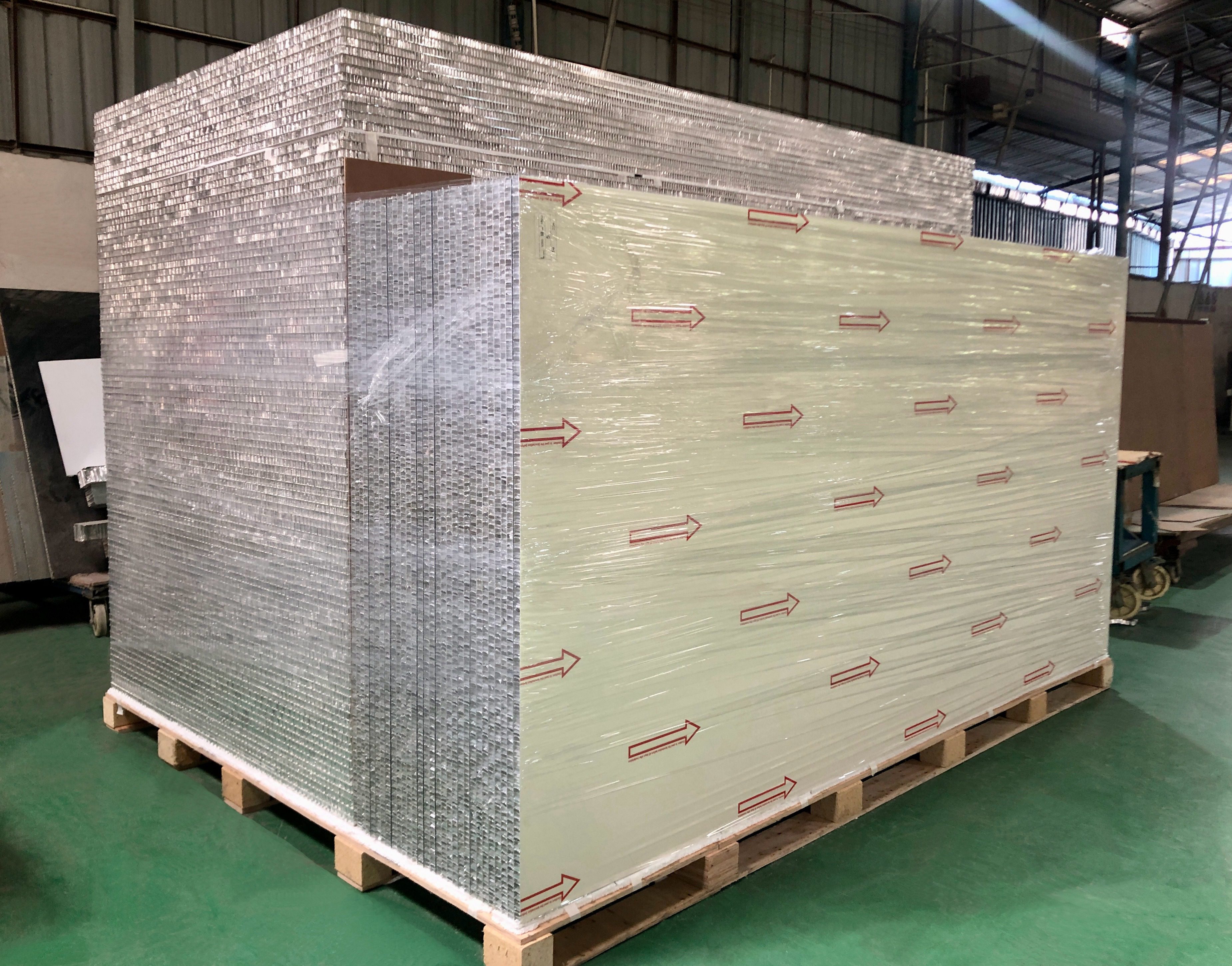 3、优越的平整度和刚性:铝蜂窝板由许多相互牵制的密集蜂窝构成,犹如许多小工字梁,可分散承受来自面板方向的压力,使板受力均匀,保证了其承受压力的强度和面板在较大面积时保持很高的平整度。