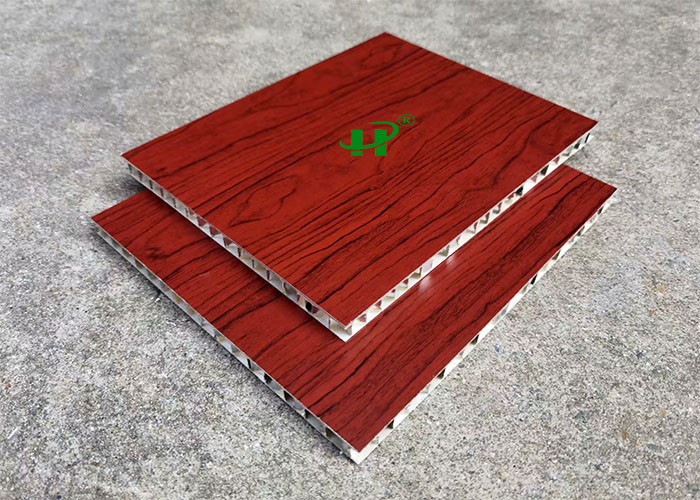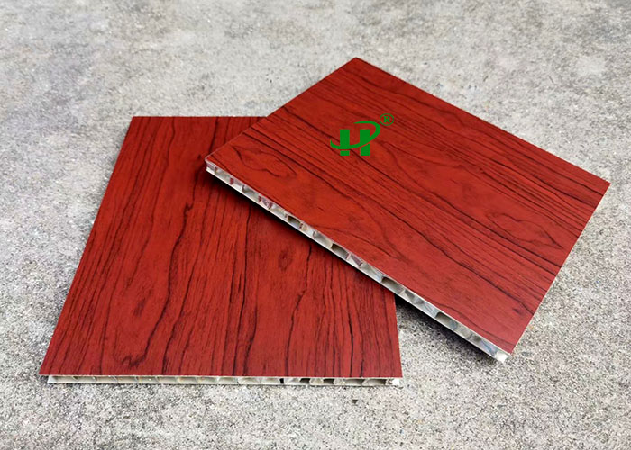 木纹铝蜂窝板是在蜂窝板的面板上进行热转印木纹处理,其木纹图案高档华丽、色泽纹理逼真、图纹牢固耐磨,木纹色凸显绿色环保的生活理念,体现出一种高档奢华的建筑风格,缓解都市人紧张工作的压力,使人有置身大自然的感觉。