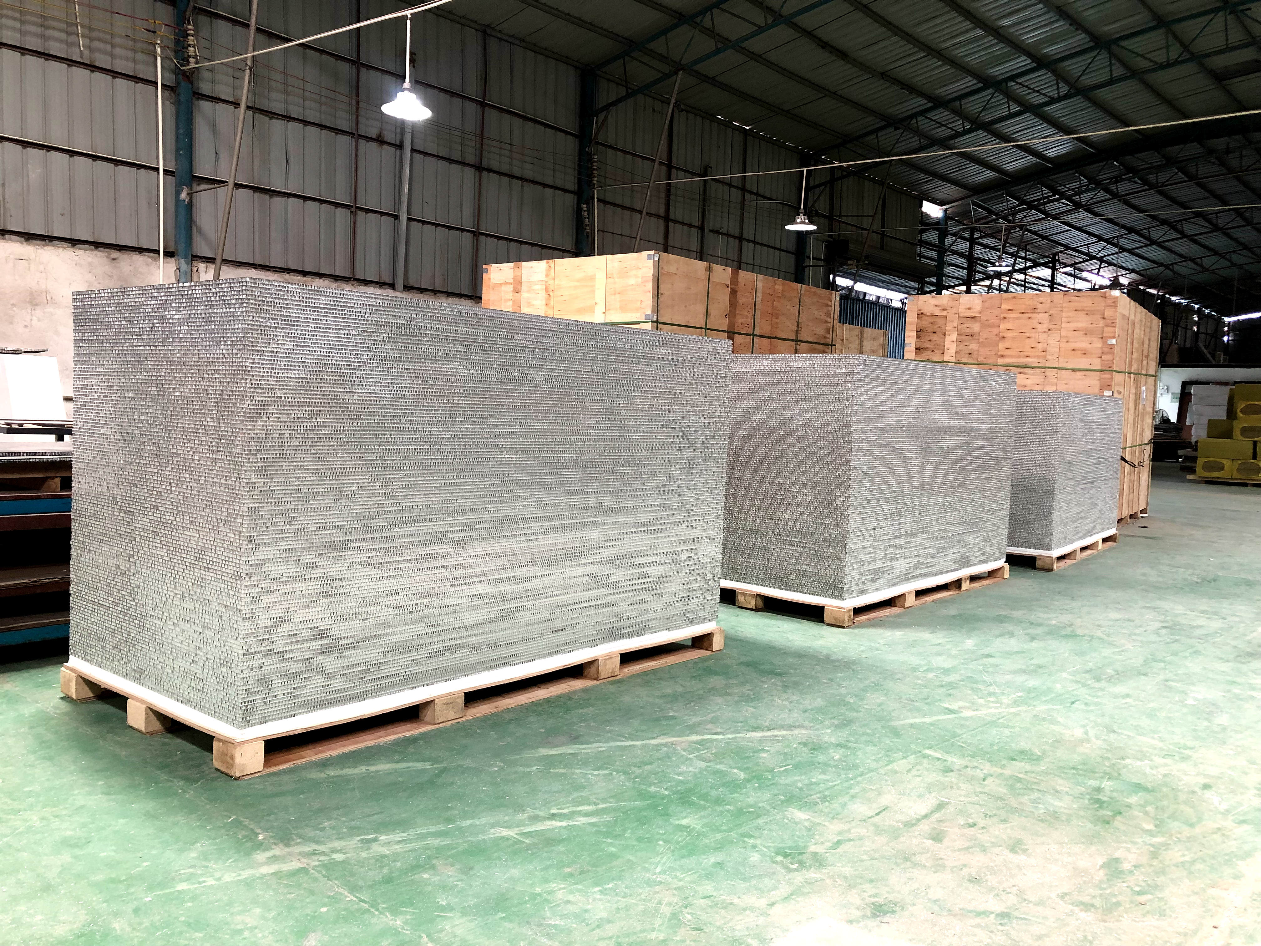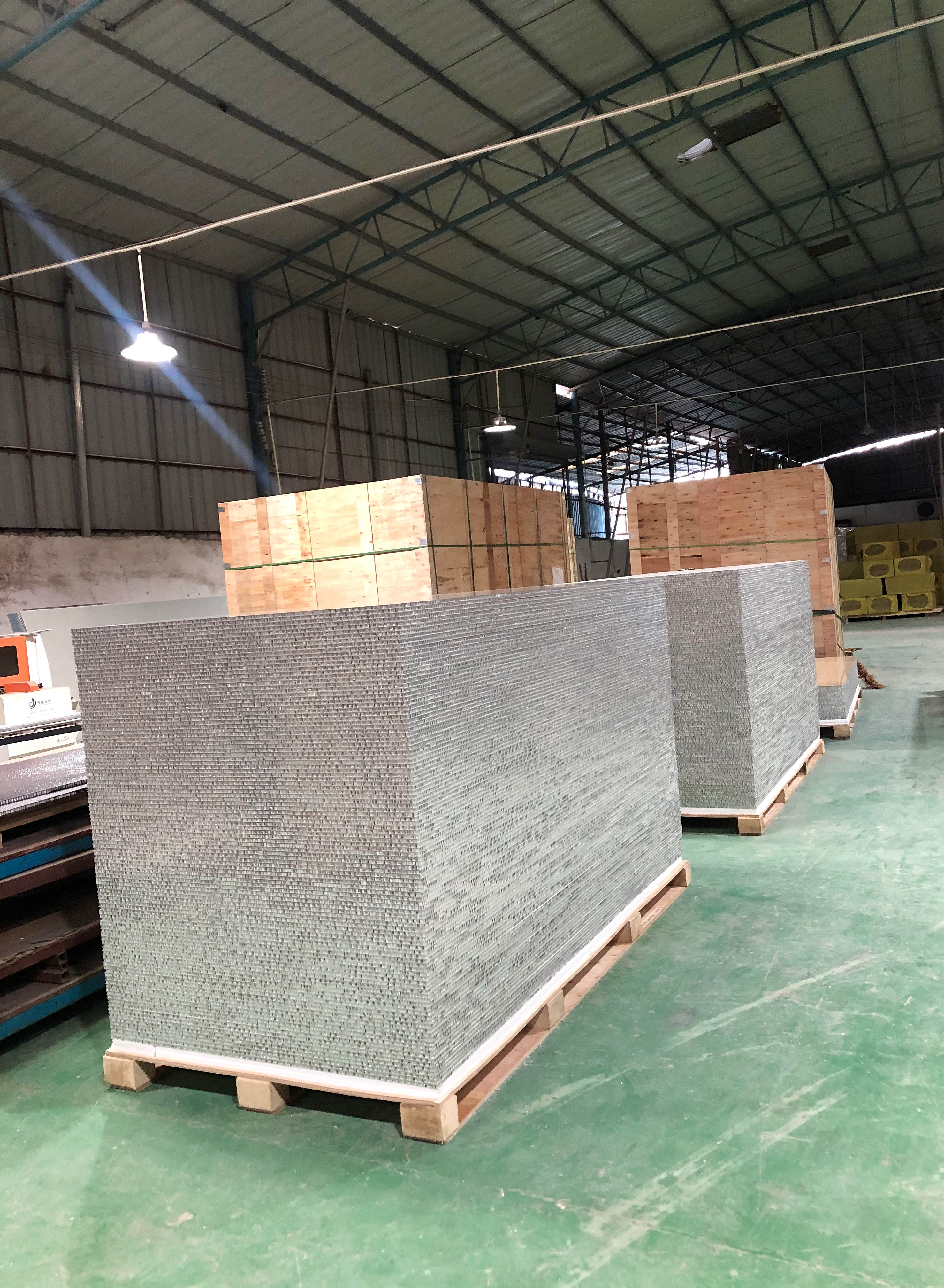 2、优越的平整度和刚性:铝蜂窝板由许多相互牵制的密集蜂窝构成,犹如许多小工字梁,可分散承受来自面板方向的压力,使板受力均匀,保证了其承受压力的强度和面板在较大面积时保持很高的平整度。