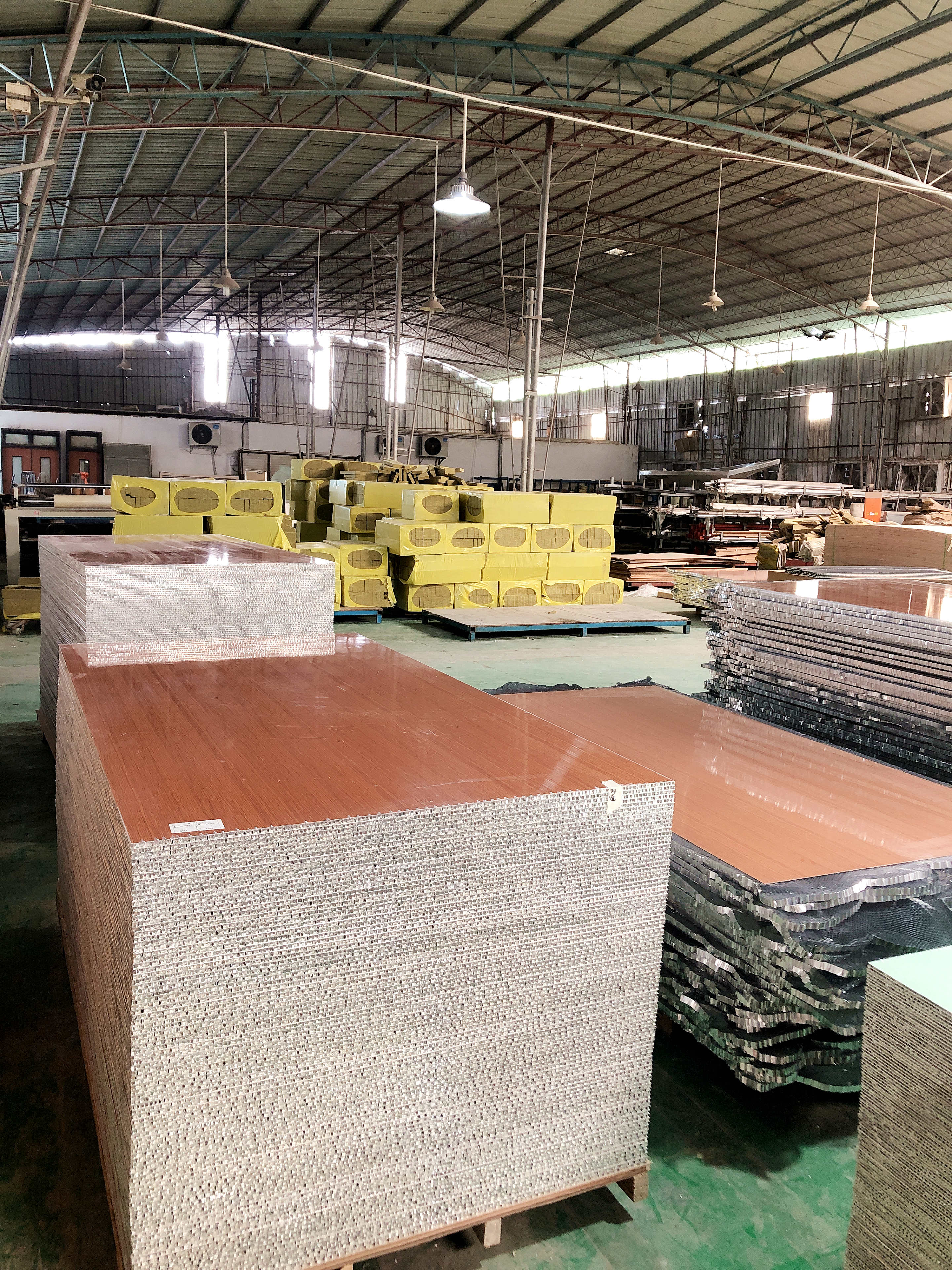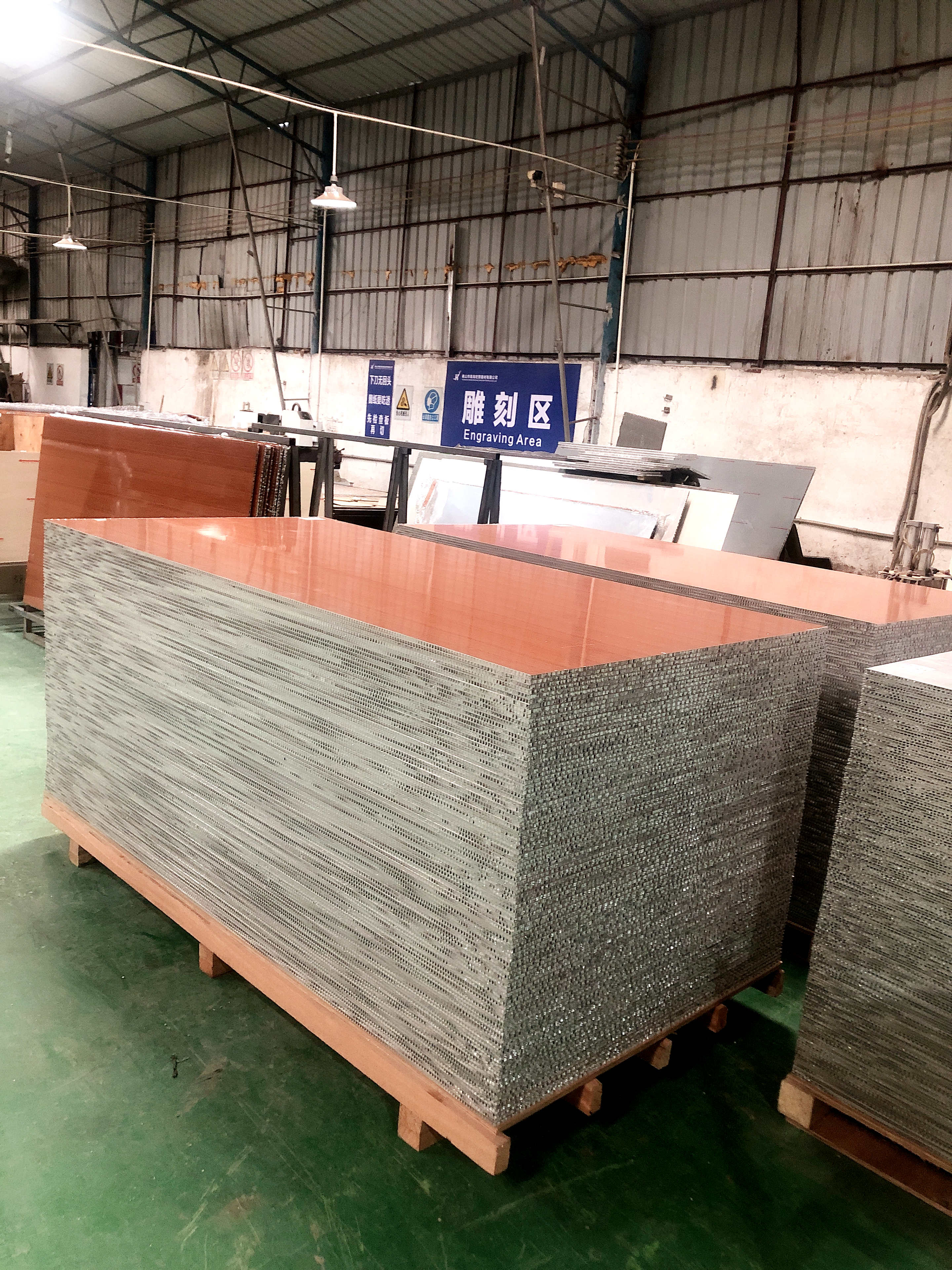 2、优越的平整度和刚性:铝蜂窝板由许多相互牵制的密集蜂窝构成,犹如许多小工字梁,可分散承受来自面板方向的压力,使板受力均匀,保证了其承受压力的强度和面板在较大面积时保持很高的平整度。