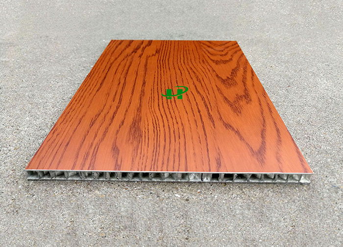 木纹铝蜂窝板是在蜂窝板的面板上进行热转印木纹处理,其木纹图案高档华丽、色泽纹理逼真、图纹牢固耐磨,木纹色凸显绿色环保的生活理念,体现出一种高档奢华的建筑风格,缓解都市人紧张工作的压力,使人有置身大自然的感觉。