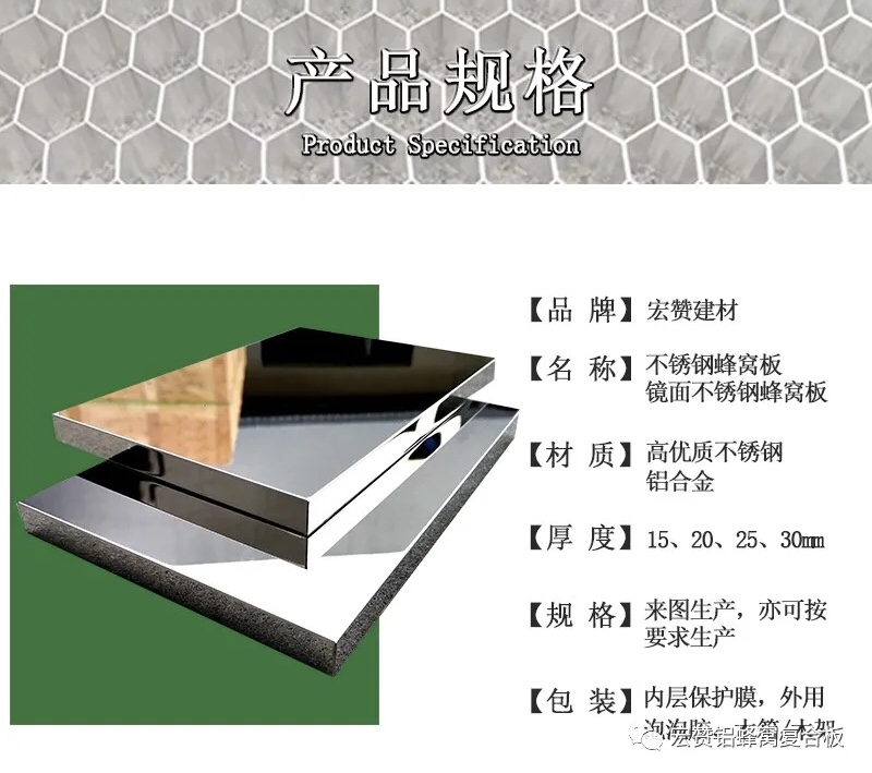 不锈钢蜂窝板面板采用拉丝不锈钢或者镜面不锈钢板,背板采用镀锌钢板,中间是符合美国航空标准的铝蜂窝,本公司从法国引进生产三明冶夹心板的专用复合工艺冷压和热压技术,专业生产此类产品,使得该产品更具显著的优异特性,广泛应用于建筑幕墙及室内外装饰,更由于本公司有专业且全面的生产工艺的保障,因此,完全可以根据客户的要求和实际情况采用不同的复合工艺生产产品。