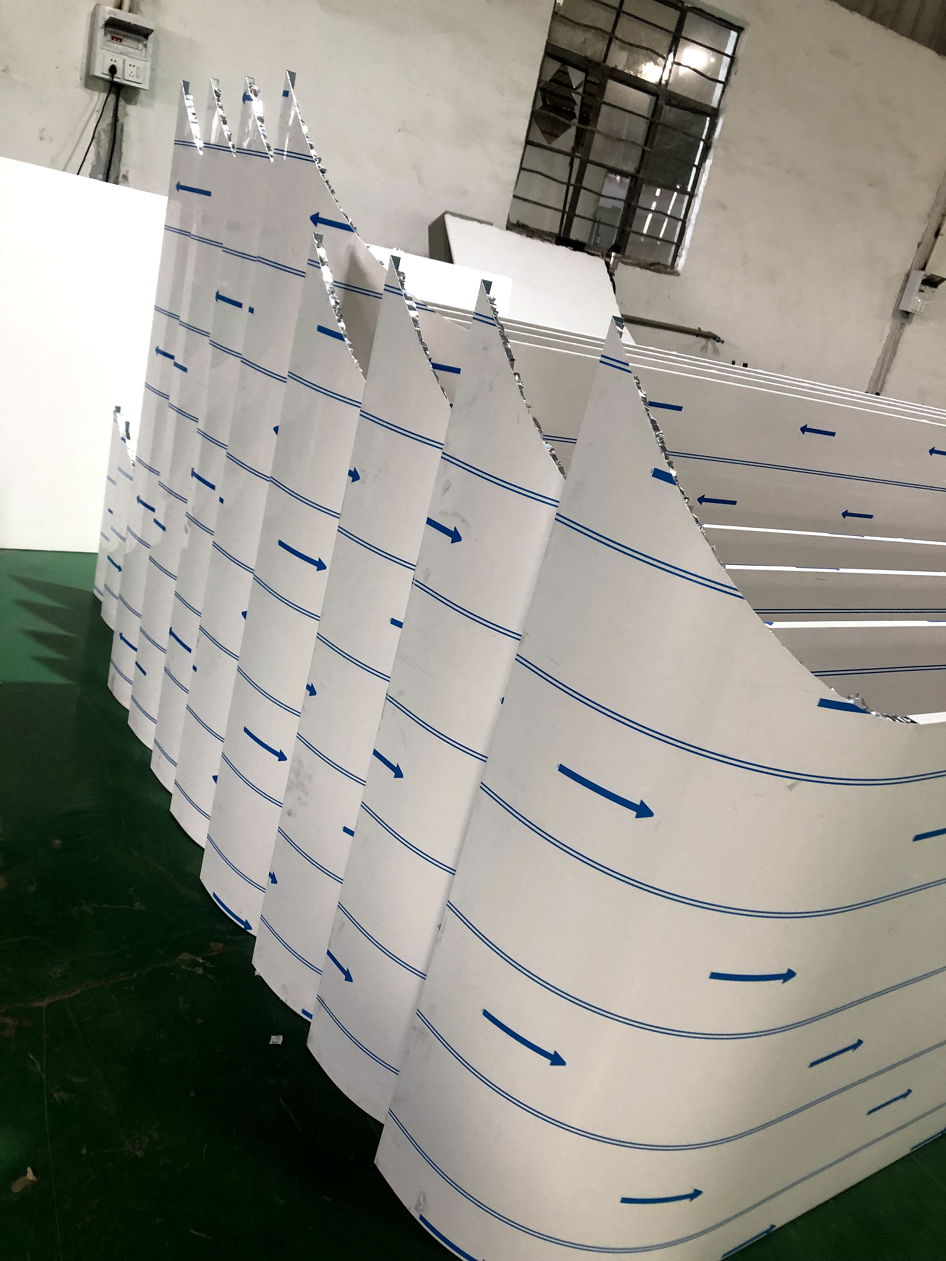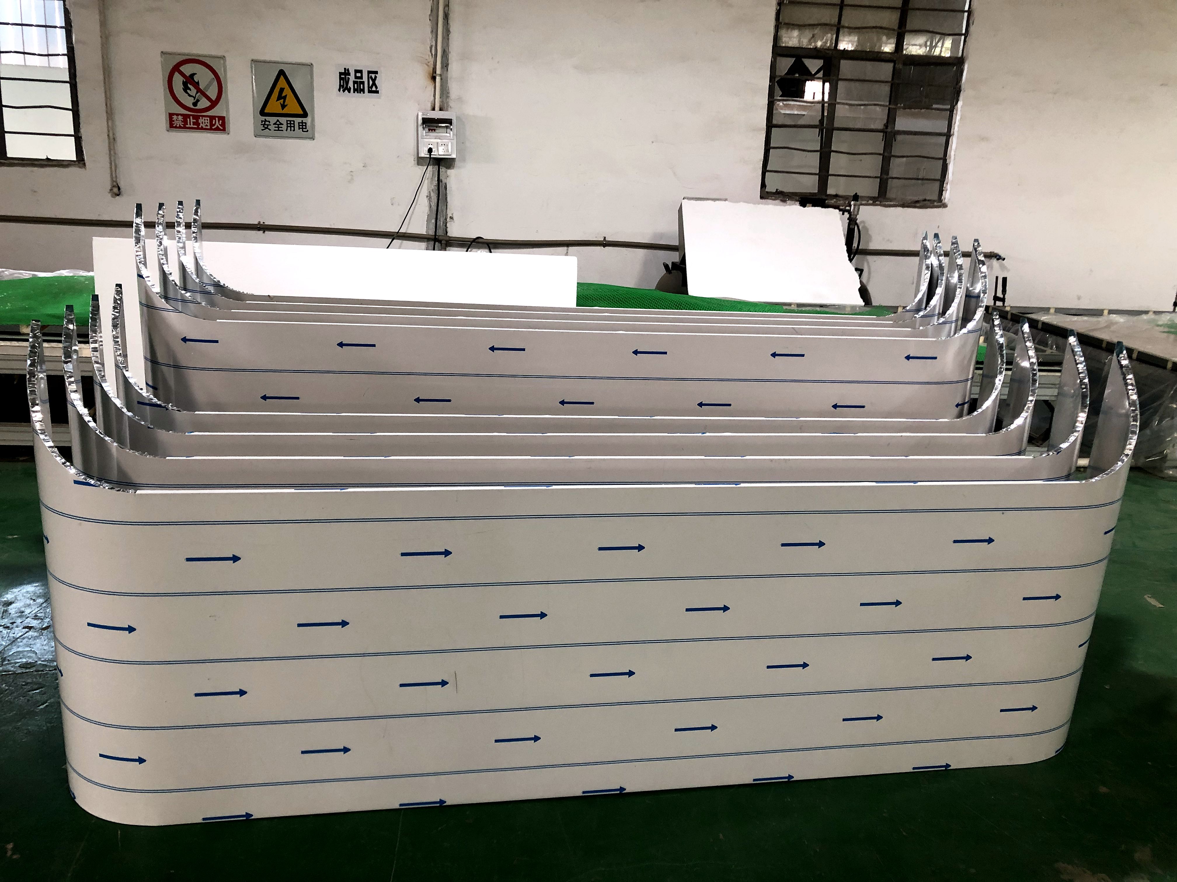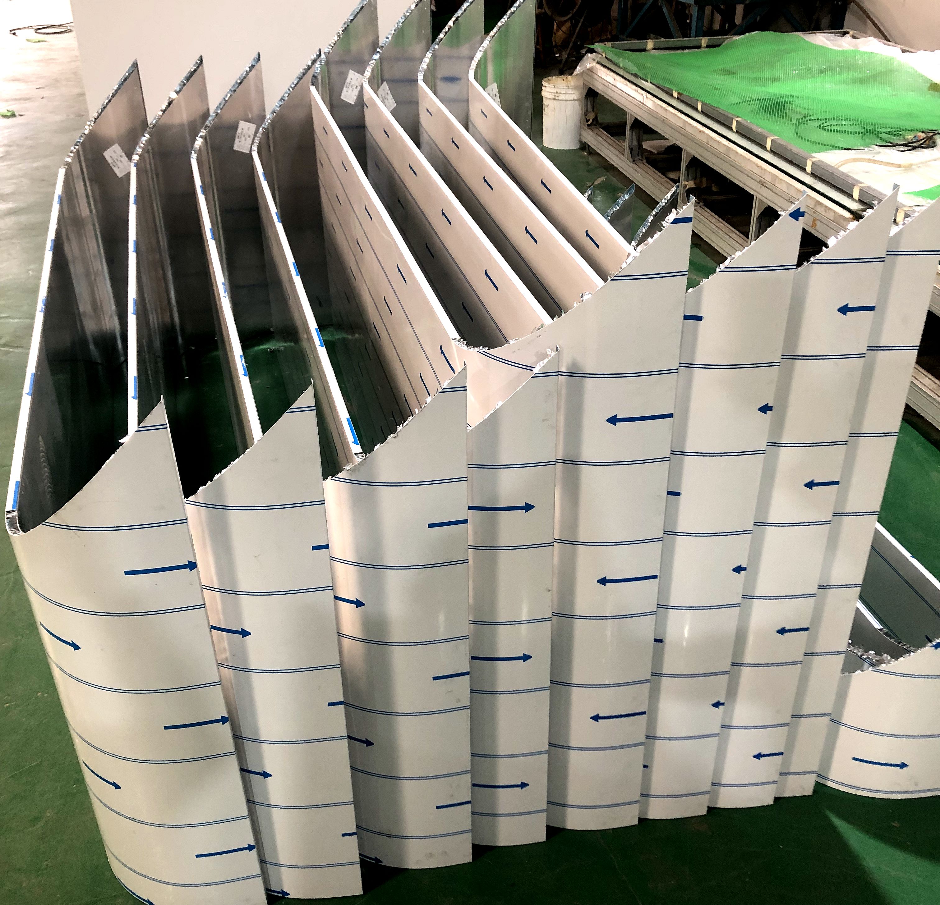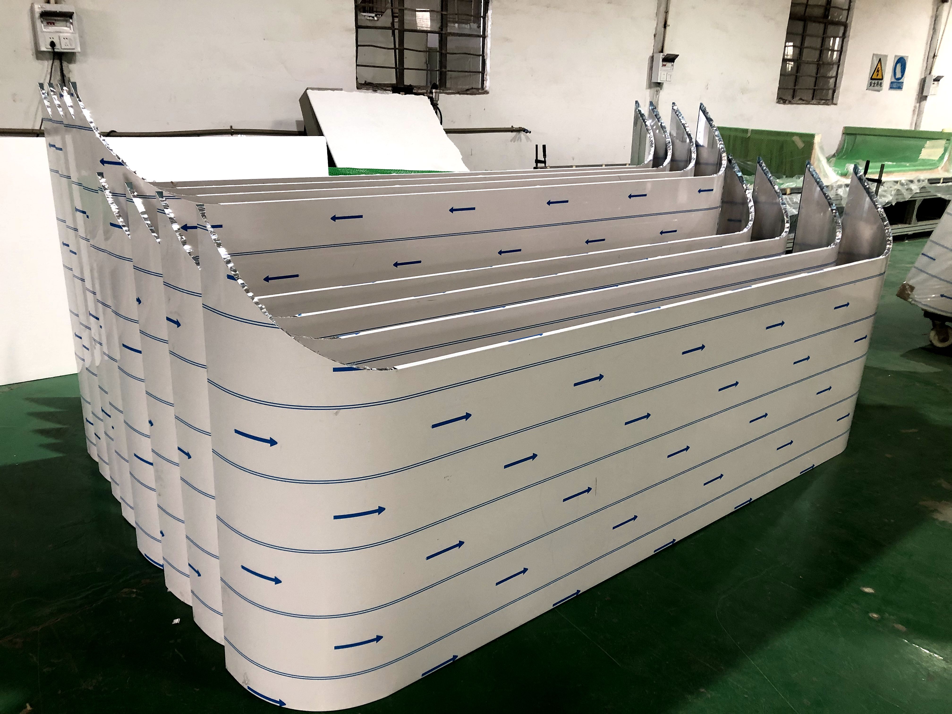 弧形蜂窝板不仅质量轻,而且强度高,能承受极高的压力而不变形。异形蜂窝板还有极好的吸热和消音功能,蜂窝芯独特的六角蜂窝结构,一方面可以把热量有效储存起来,达到吸热、隔热、保温作用,另一方面可以让外来的声波在蜂窝芯窝状结构里多次反射,不断削弱,直至消失,达到良好的吸音、隔音、消音功能。