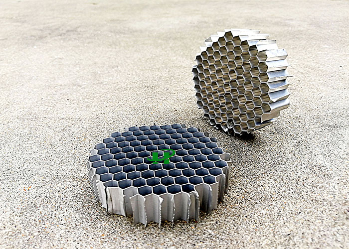 铝蜂窝板芯为六边形铝蜂窝结构,相互牵制的密集蜂窝犹如许多小工字梁,可分散承担来自面板方向的压力,使板受力均匀,保证了面板在较大面积时仍能保持很高的平整度。另外,空心蜂窝还能大大减弱板体的热膨胀性。