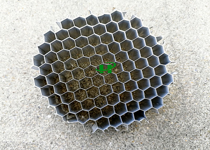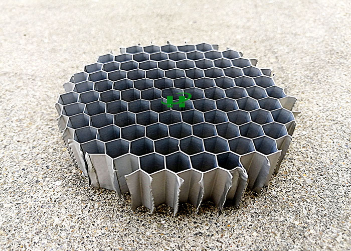 铝蜂窝板芯为六边形铝蜂窝结构,相互牵制的密集蜂窝犹如许多小工字梁,可分散承担来自面板方向的压力,使板受力均匀,保证了面板在较大面积时仍能保持很高的平整度。另外,空心蜂窝还能大大减弱板体的热膨胀性。
