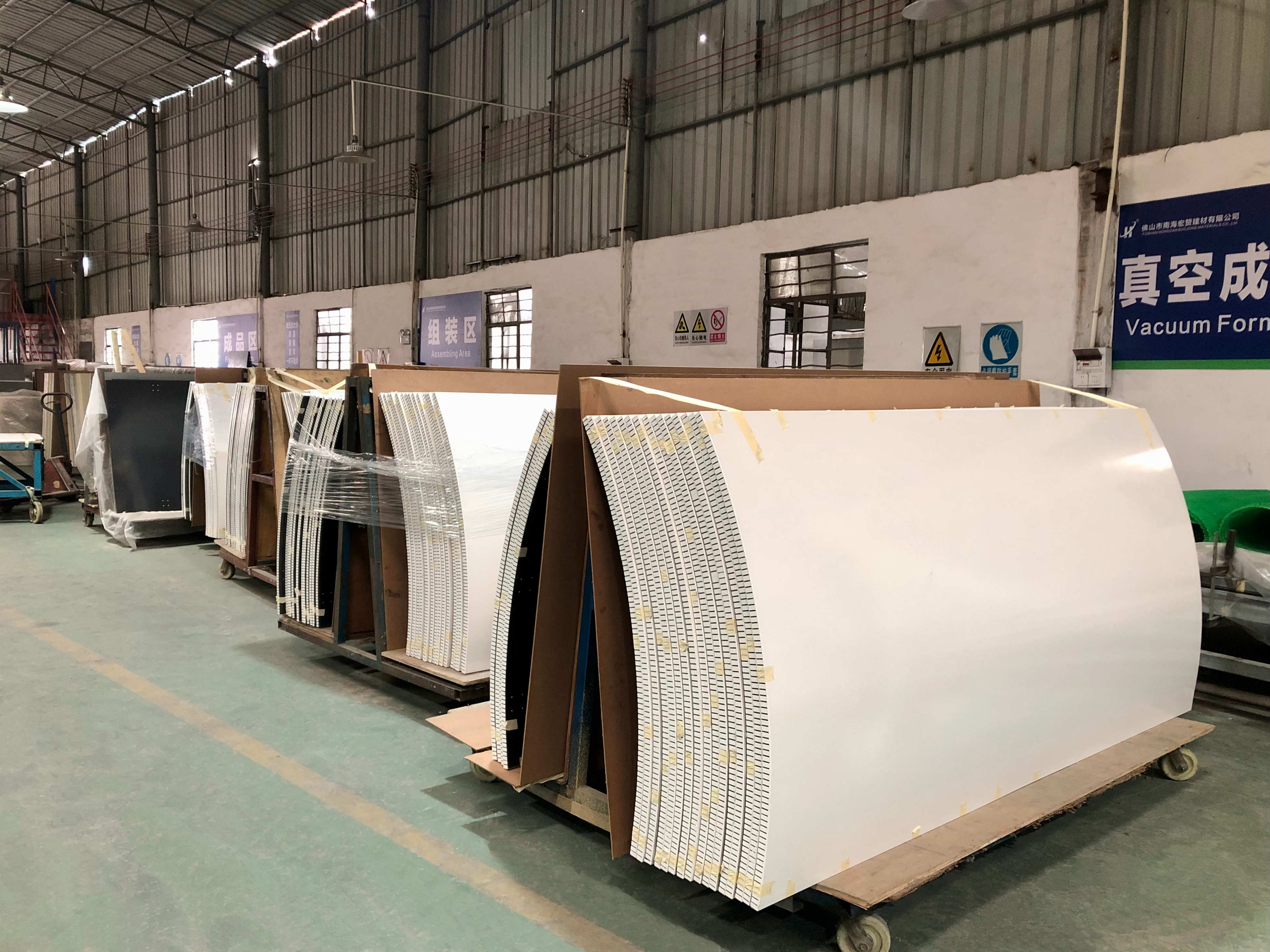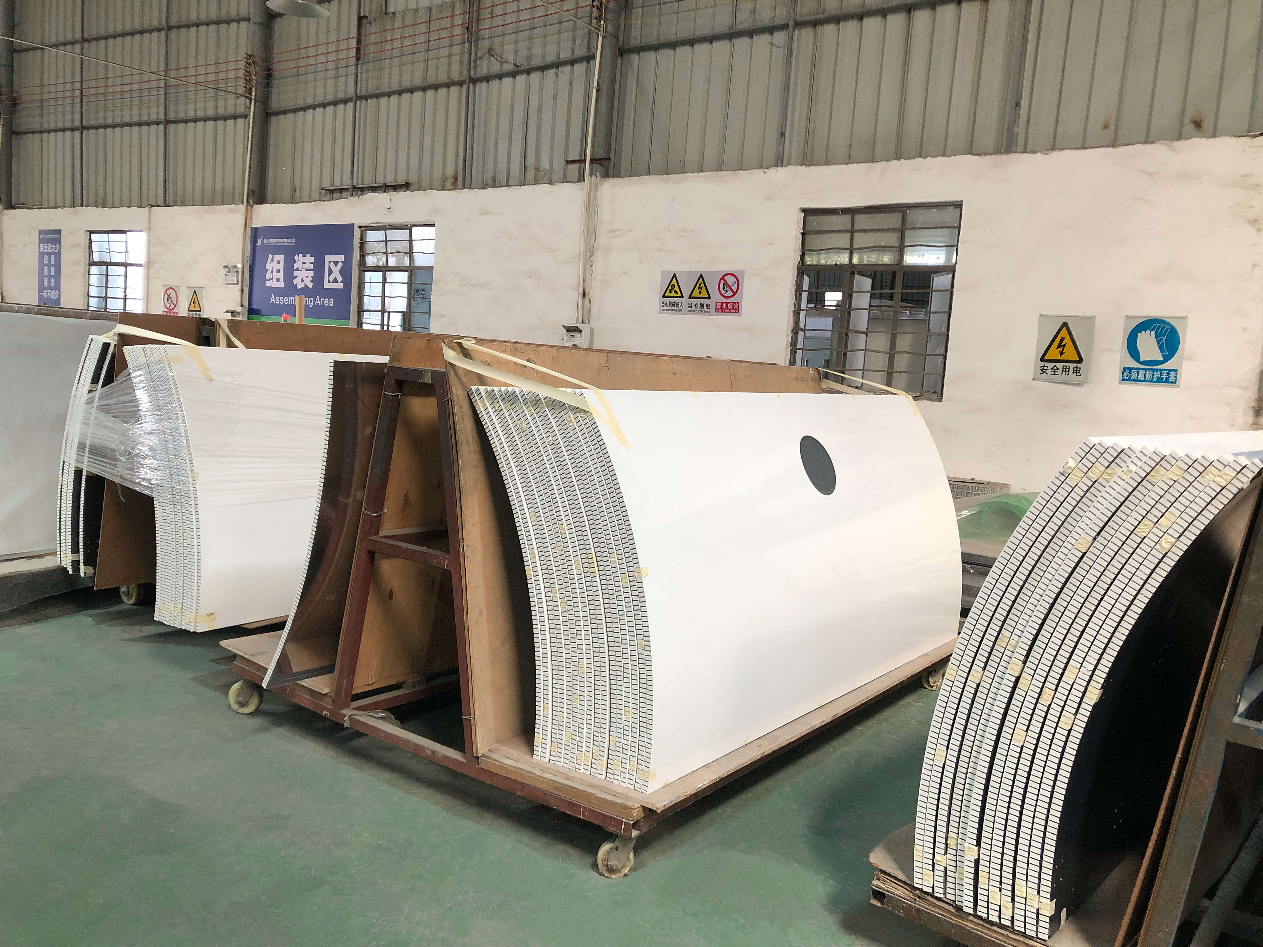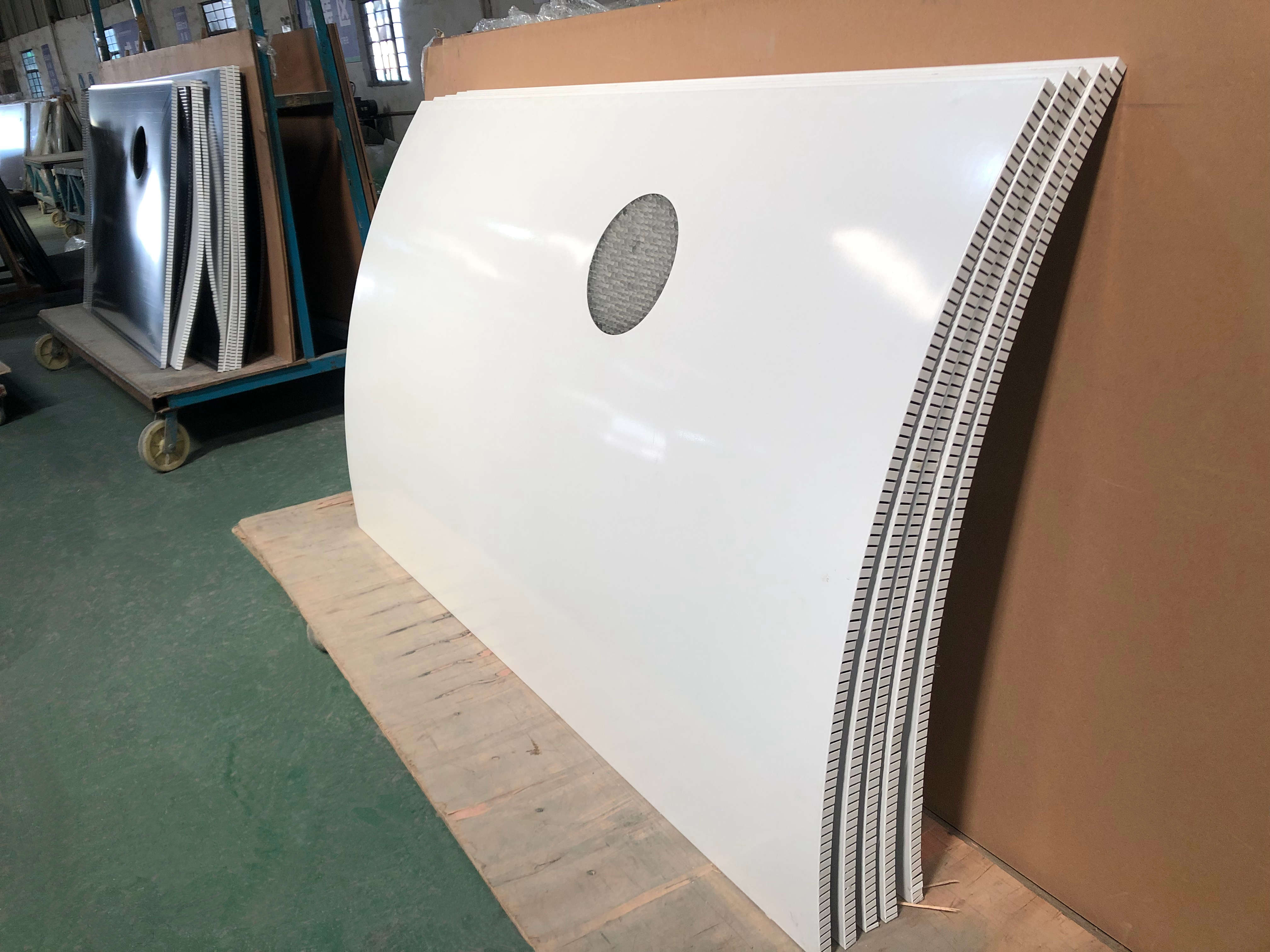弧形蜂窝板不仅质量轻,而且强度高,能承受极高的压力而不变形。异形蜂窝板还有极好的吸热和消音功能,蜂窝芯独特的六角蜂窝结构,一方面可以把热量有效储存起来,达到吸热、隔热、保温作用,另一方面可以让外来的声波在蜂窝芯窝状结构里多次反射,不断削弱,直至消失,达到良好的吸音、隔音、消音功能。