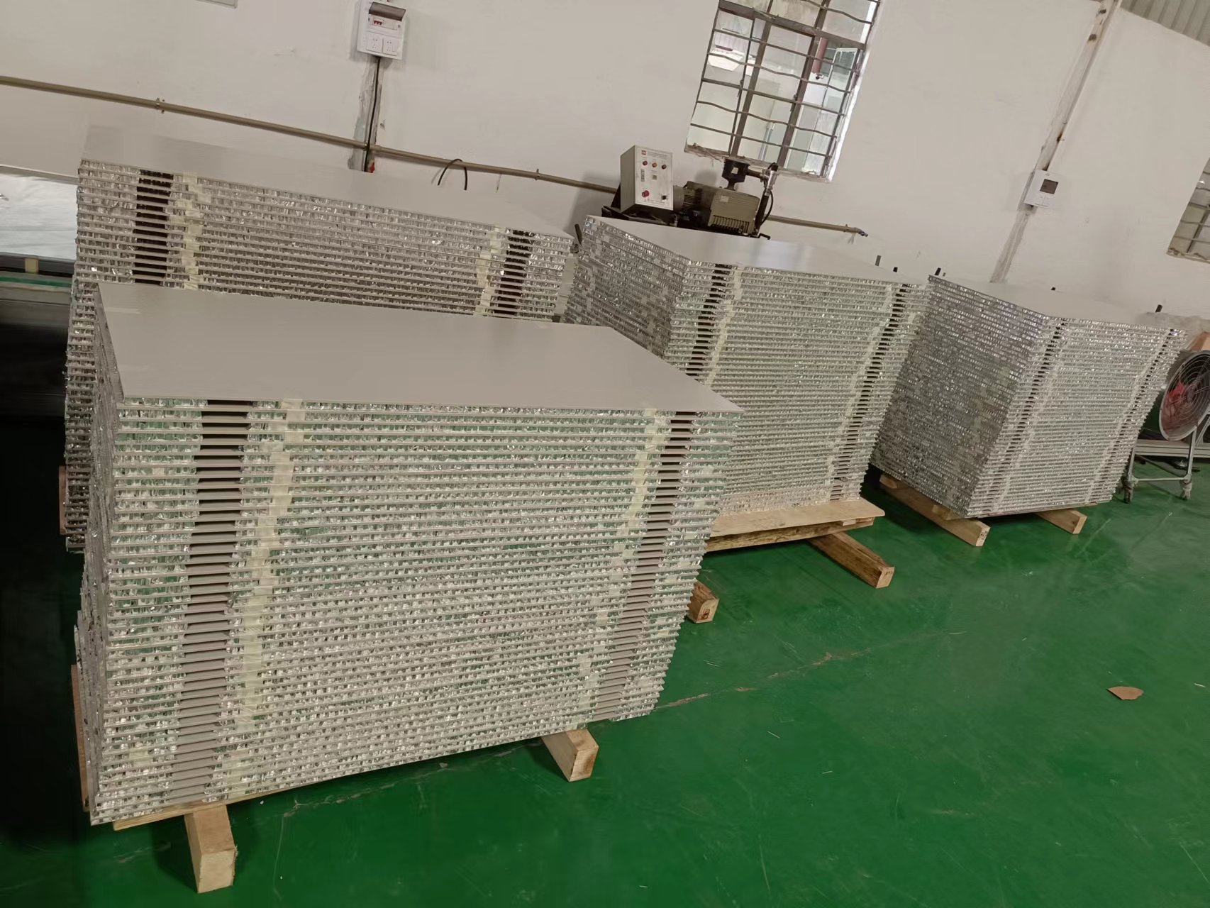 蜂窝陶瓷复合板是本公司利用法国航空复合技术将铝蜂窝与薄陶瓷复合生产的高科技含量产品。蜂窝陶瓷板由于饰面陶瓷板厚度的减薄,加上蜂窝板结构自身具有重量轻、强度高、刚度好等优点,使得蜂窝陶瓷板既具有陶瓷的表面效果,又具有一般陶瓷板不可能具有的性能。